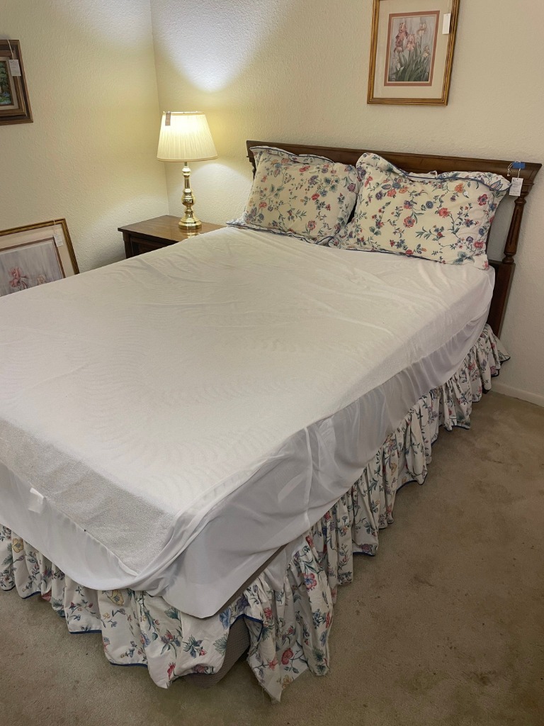 Queen bed frame, mattress, boxspring