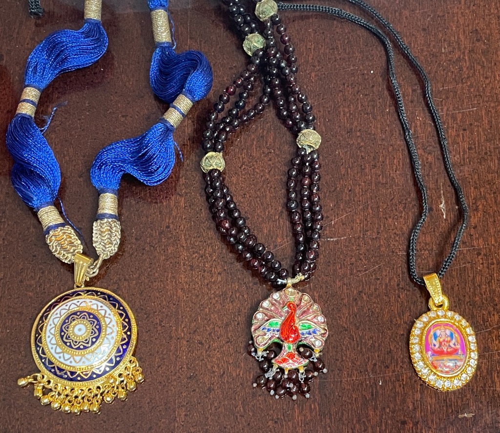 - Assorted Pendants and Necklaces: Enamel Medallion, Garnet Peacock, and Religious Oval