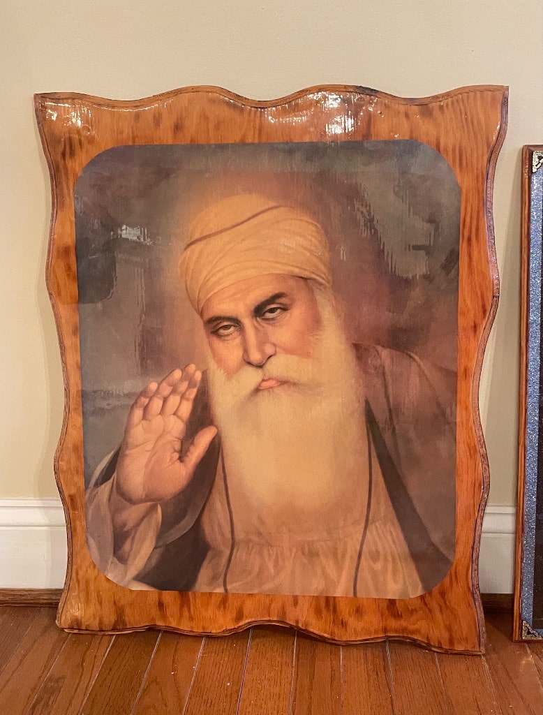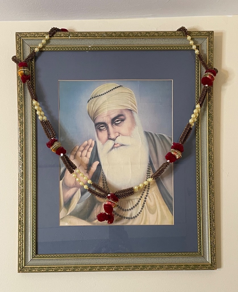- Framed Portrait of Guru Nanak Dev Ji with Decorative Garland