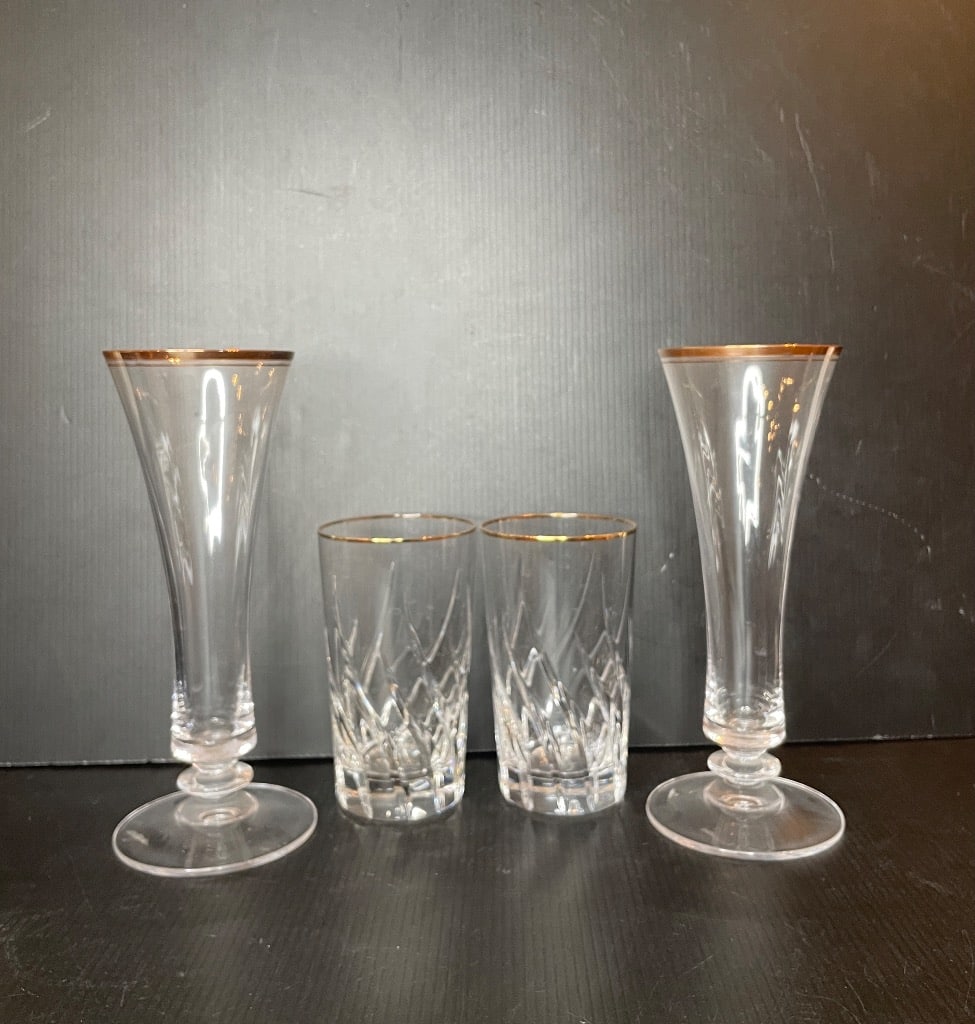 - Gold Rimmed Crystal Trumpet Glasses and Tumblers