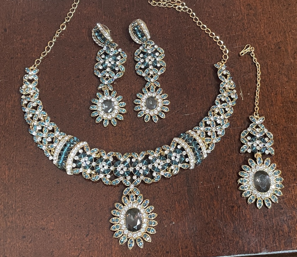 - Indian Bridal Jewelry Set with Necklace, Earrings, and Tikka – Teal and Smoky Grey Stones