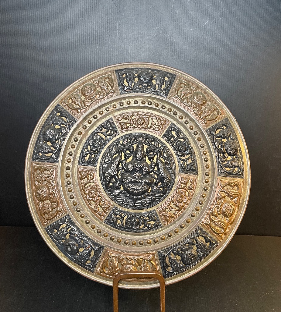 - Vintage Indian Relief Carved Metal Plate with Lakshmi and Elephants