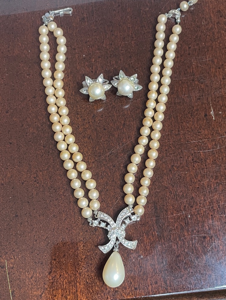 - Vintage Two-Strand Faux Pearl Necklace and Starburst Earring Set with Rhinestone Clasp
