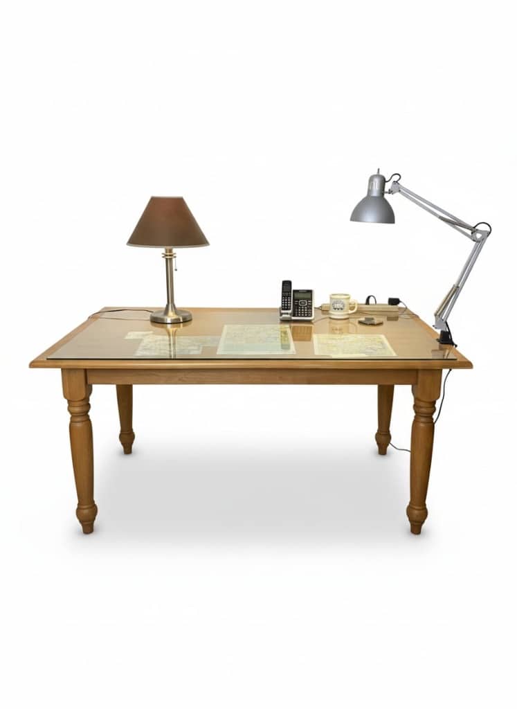 - Wooden Desk with Glass Top and Desk Lamp