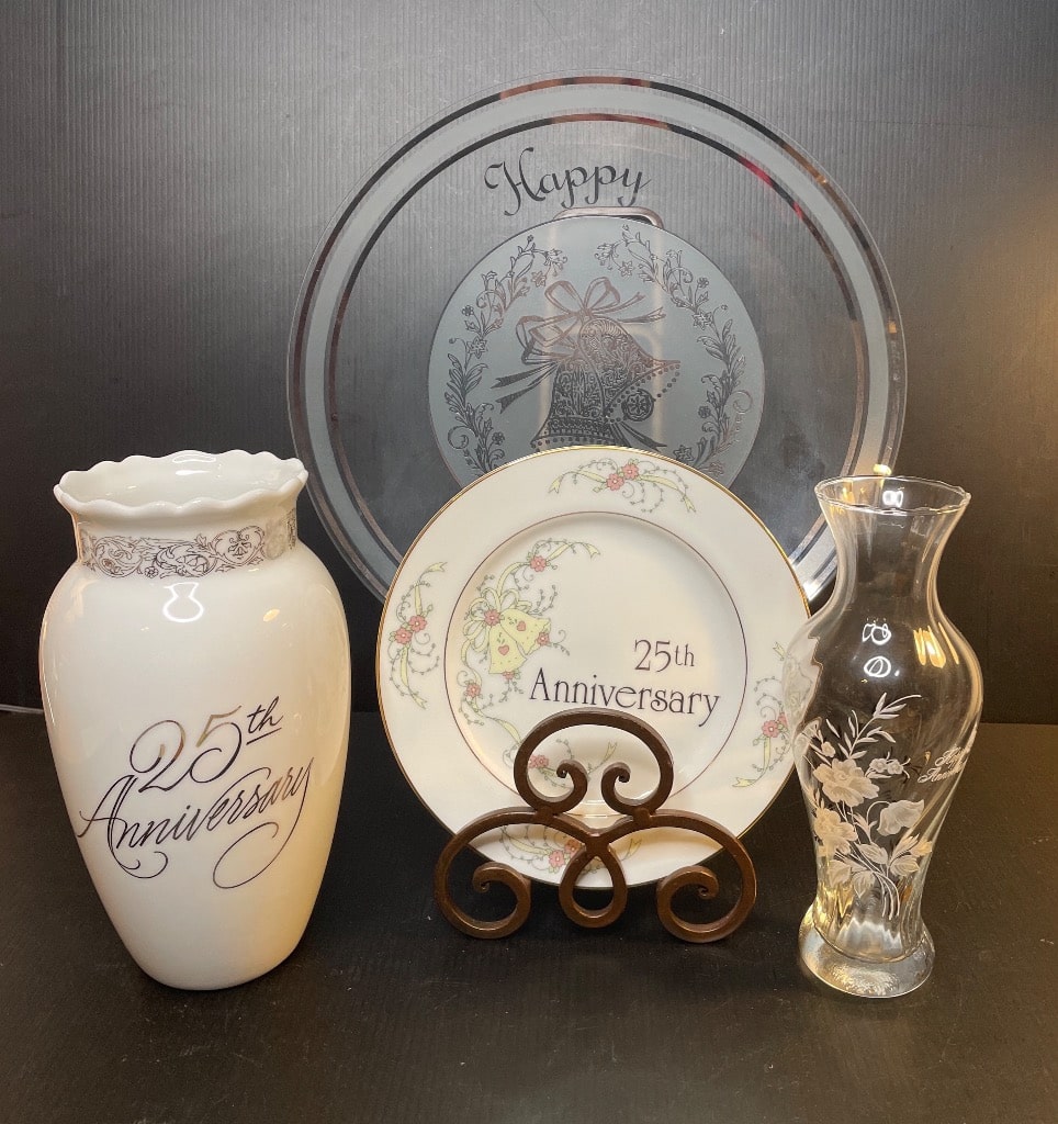 - 25th Anniversary Decorative Plate, Vases, and Platter Set