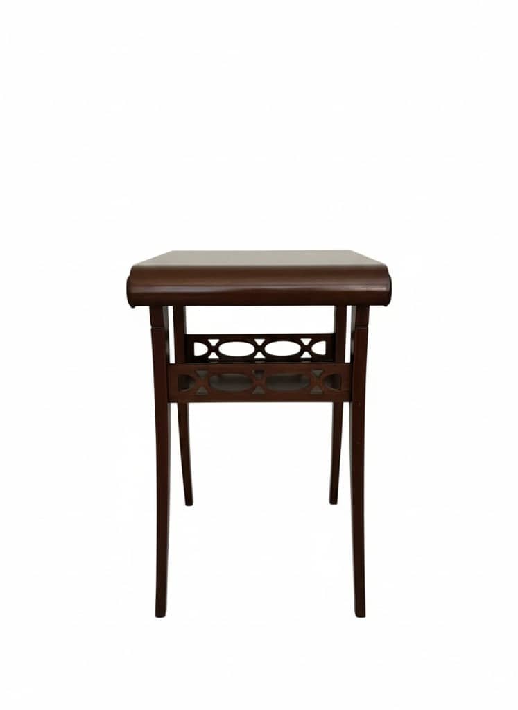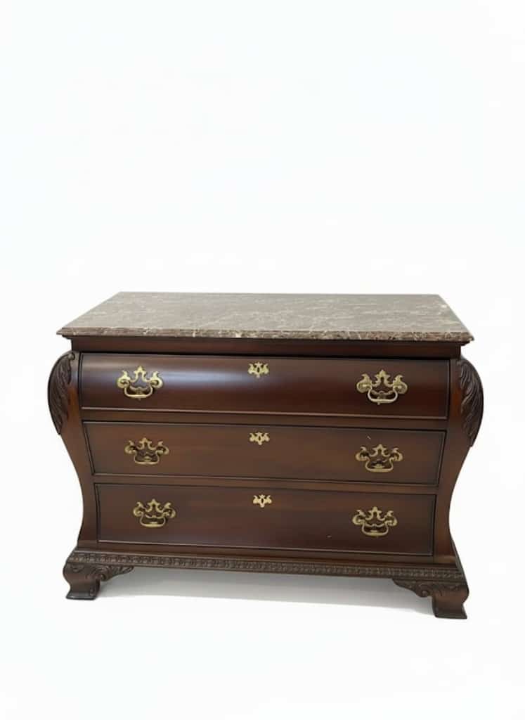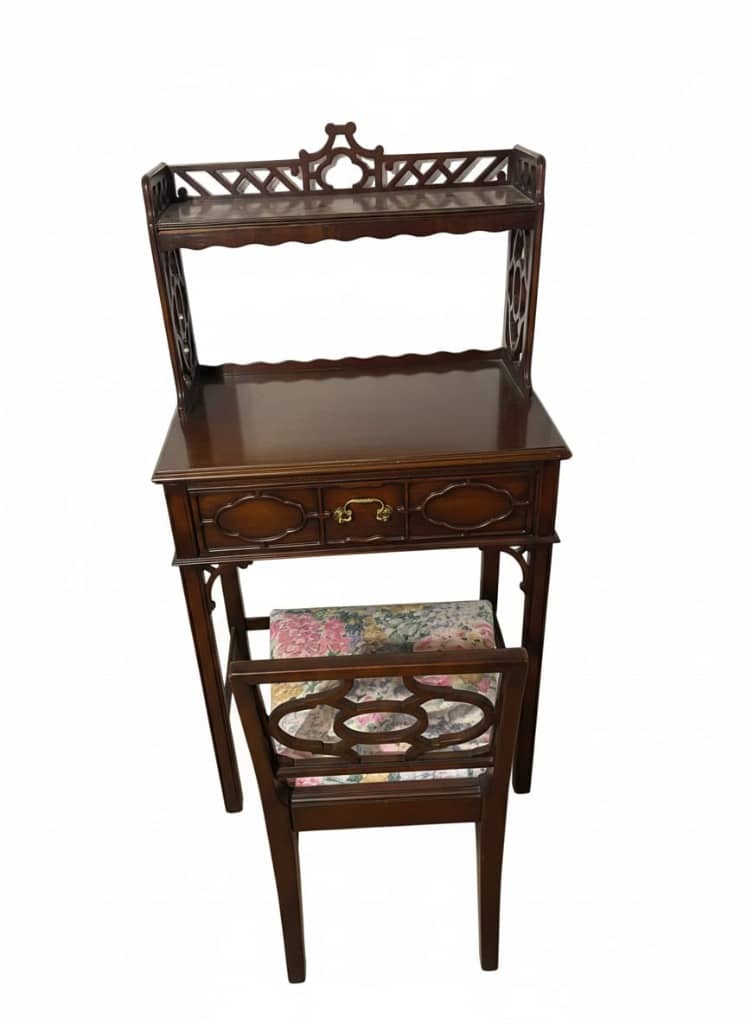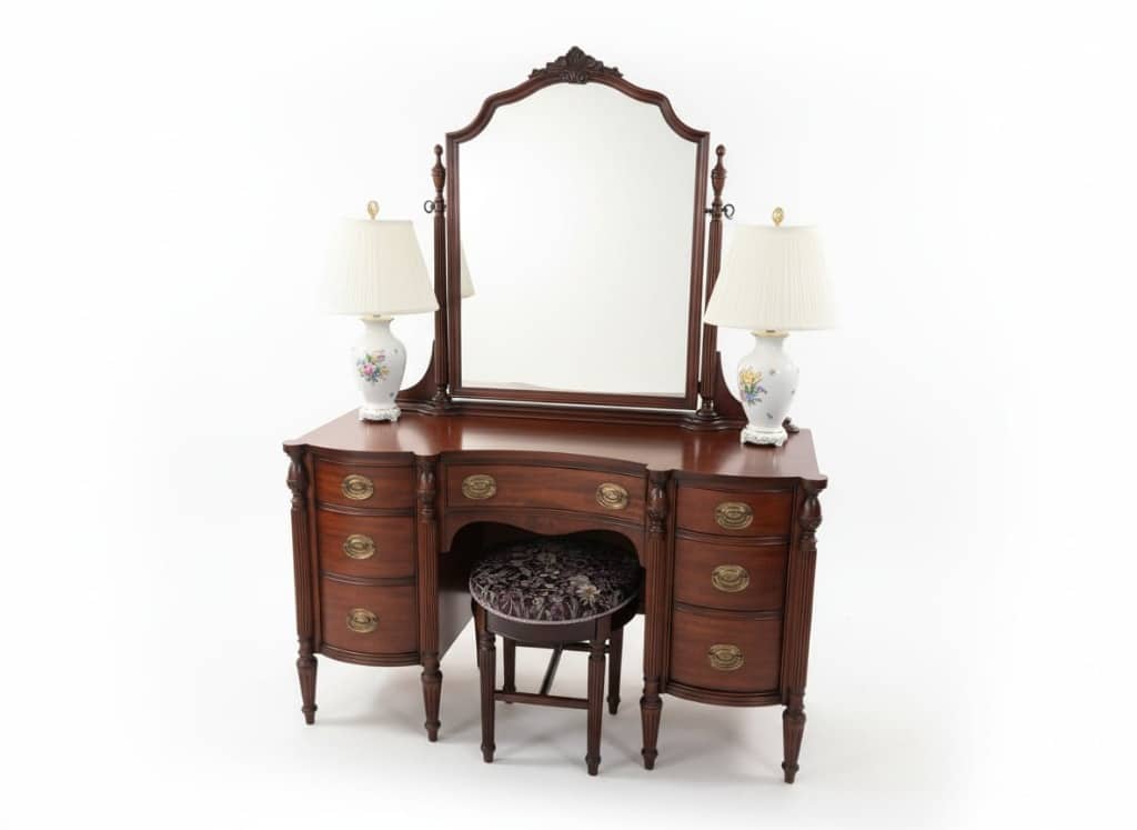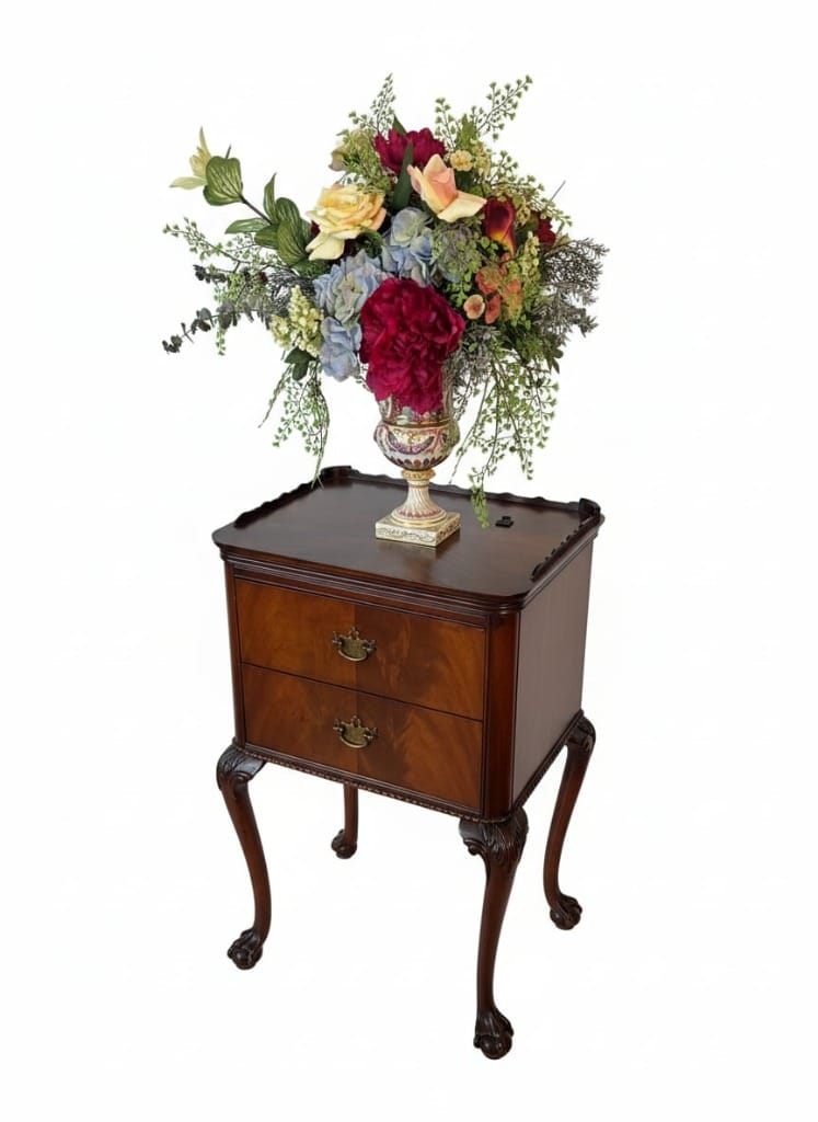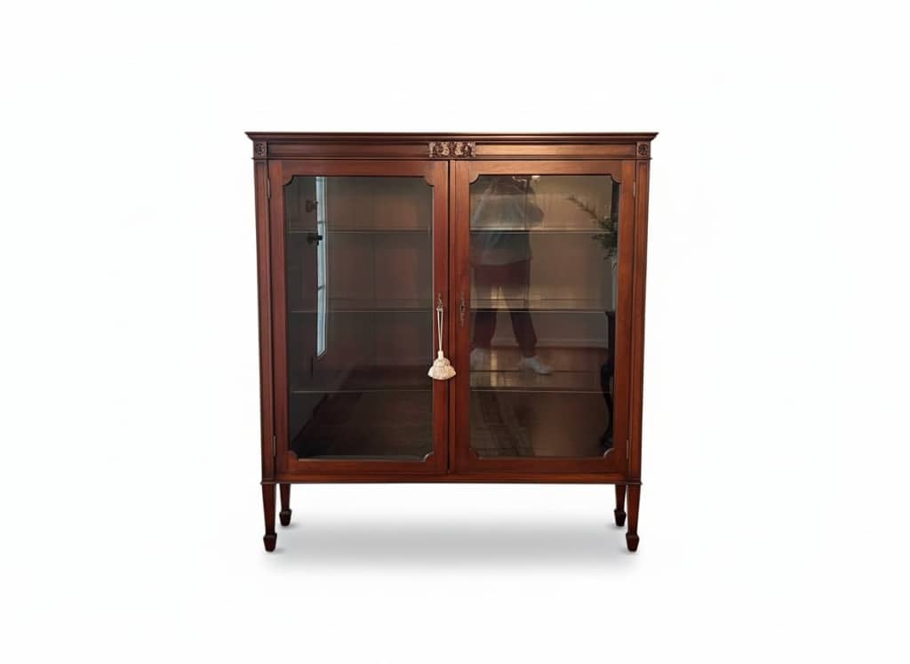 Adding to the appeal is a beautiful assortment of antique and vintage mahogany furniture, highlighting quality craftsmanship and classic design.