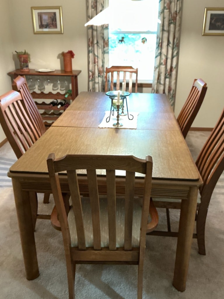 Oak Mission Style Dining Set with Six Chairs and Dining Pad Covers
