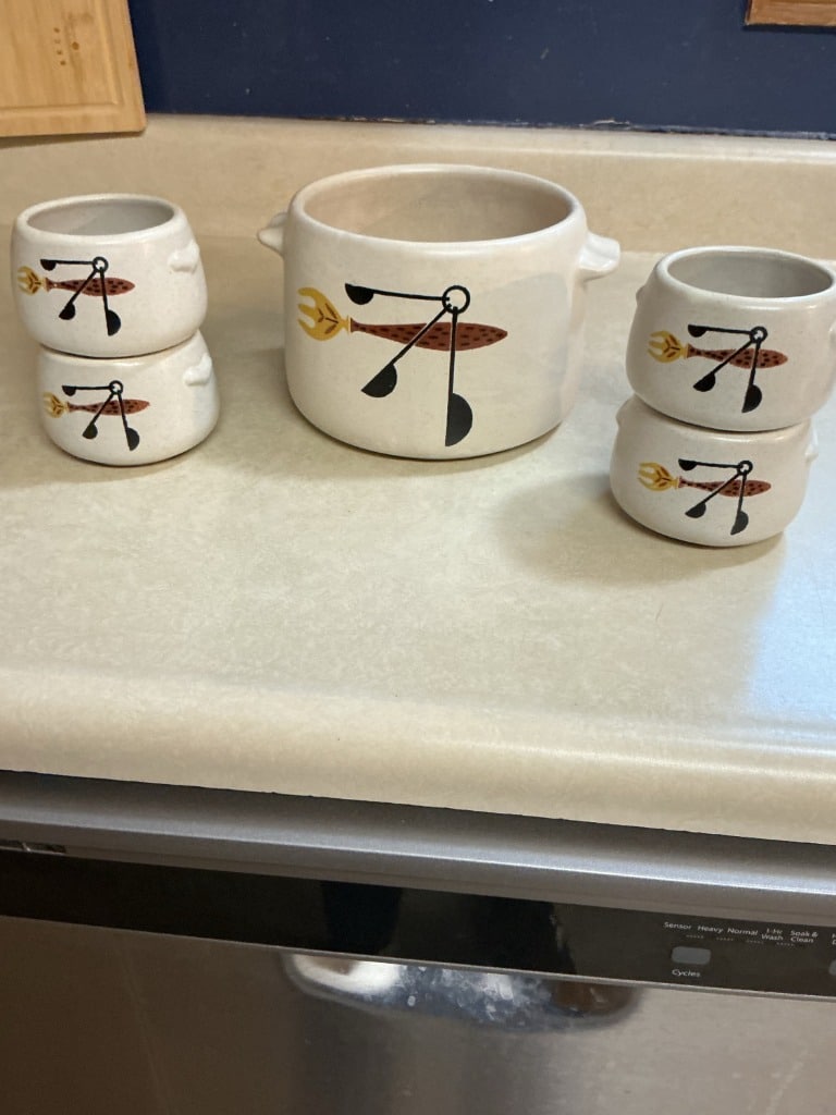 West Bend Bean Pot Set with Lids and Tongs – Fish & Utensils Pattern
