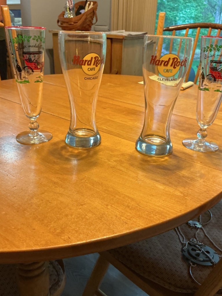 Assorted Collectible Glasses: Hard Rock Cafe (Chicago, Cleveland) and Vintage Car (Buick Model C)