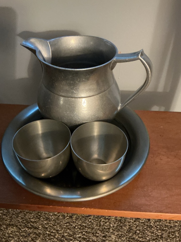 Pewter Pitcher, Two Cups, and Dish Set
