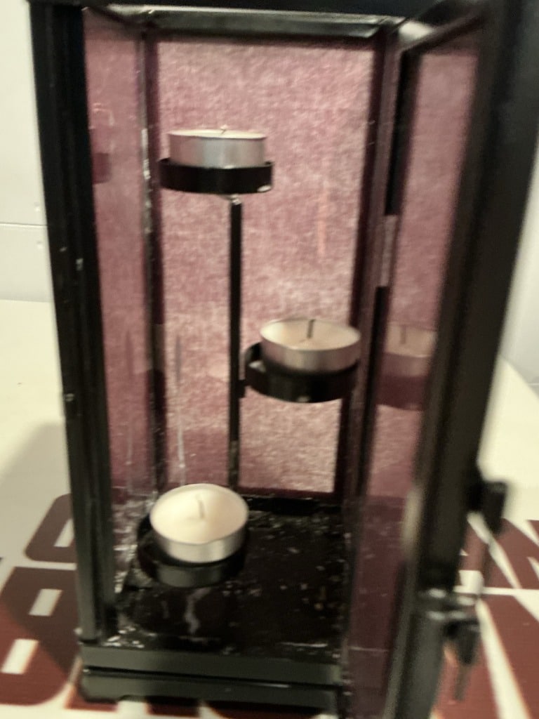 Black Metal Lantern with Purple Glass and Tealight Holders