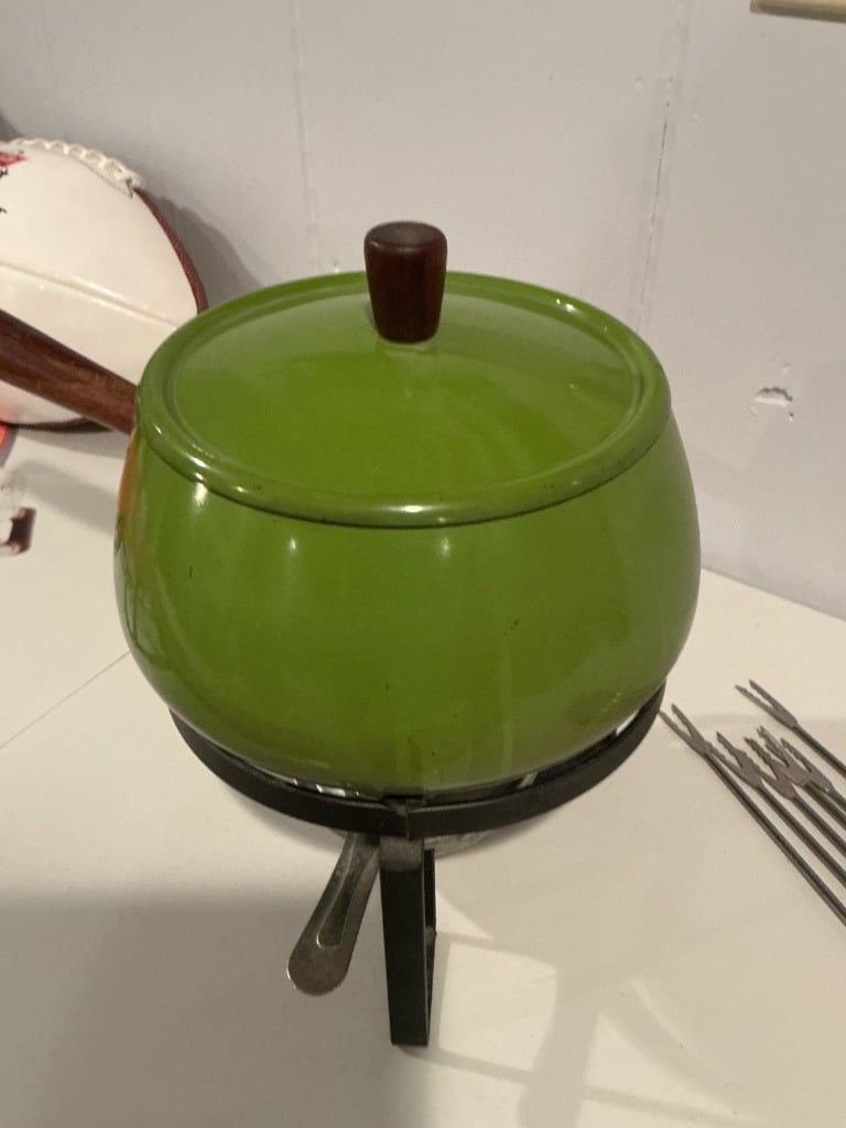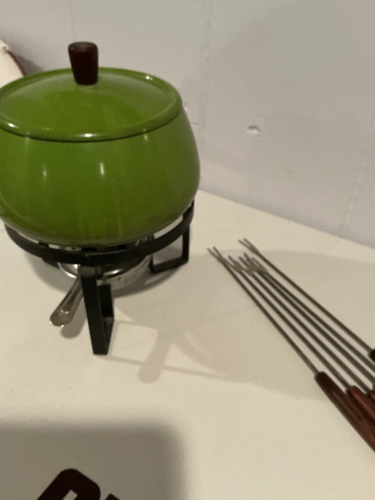 Vintage Avocado Green Enamel Fondue Pot Set with Forks