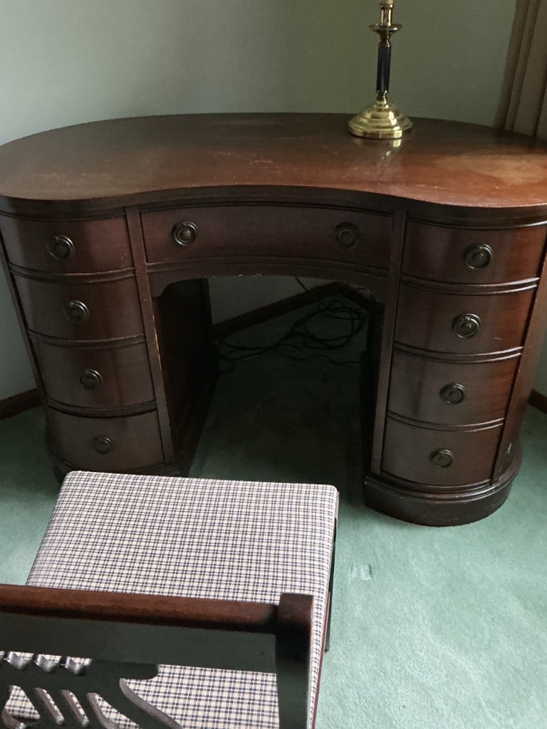 Vintage Kidney Shaped Mahogany Desk and Stool