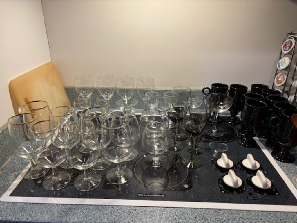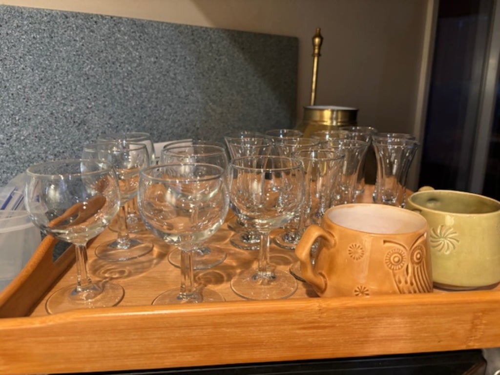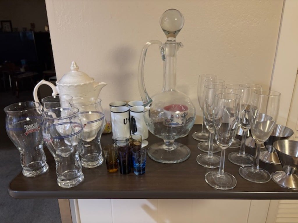 **Elegant Glassware:** A beautiful selection of glassware, from delicate crystal pieces to colorful vintage sets, perfect for entertaining or display.