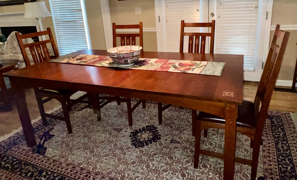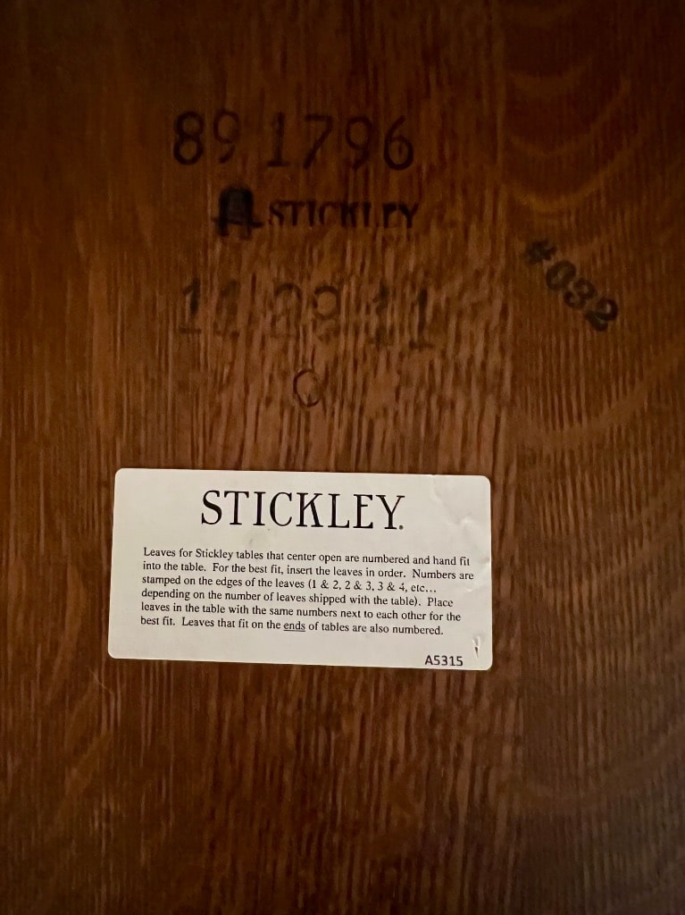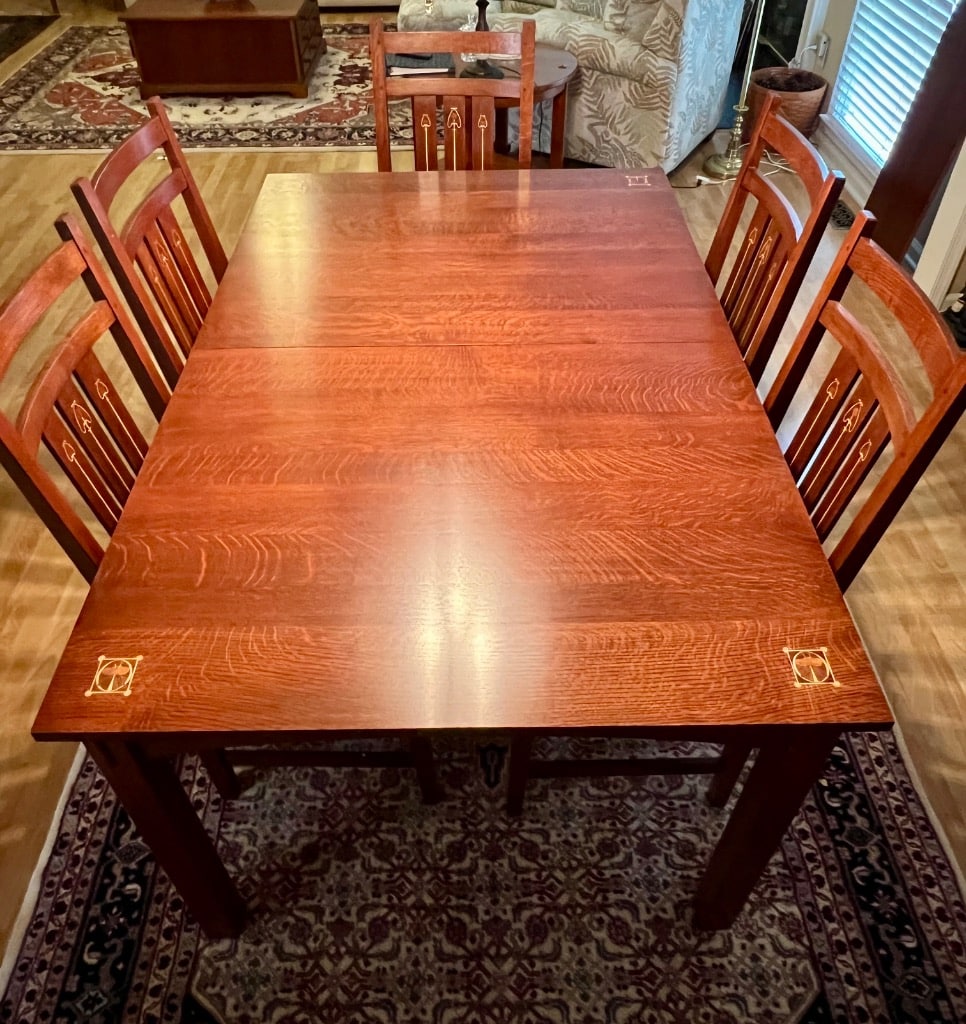 Stickley Dining table with two leaves, 2 arm and 6 side chairs