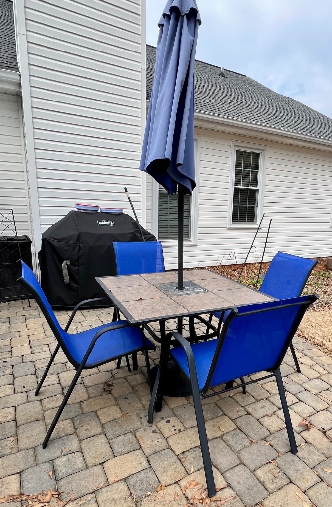 Patio tile top dining table with 4 sling chairs, umbrella and stand