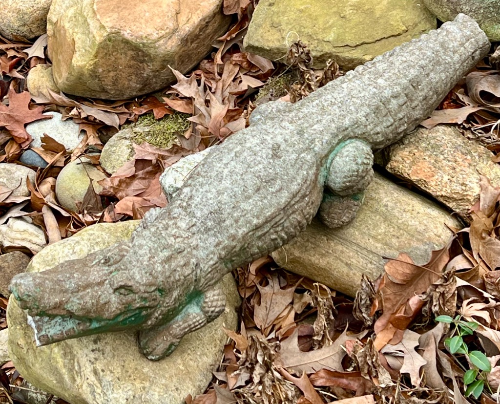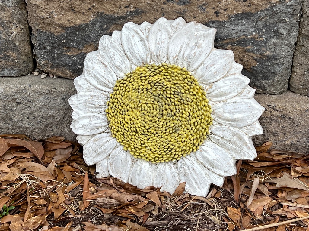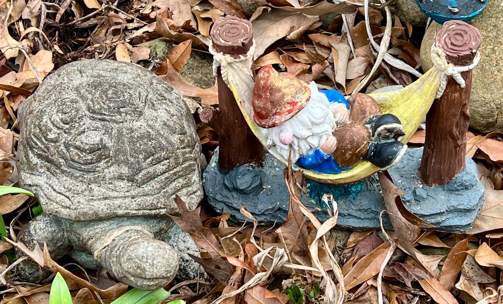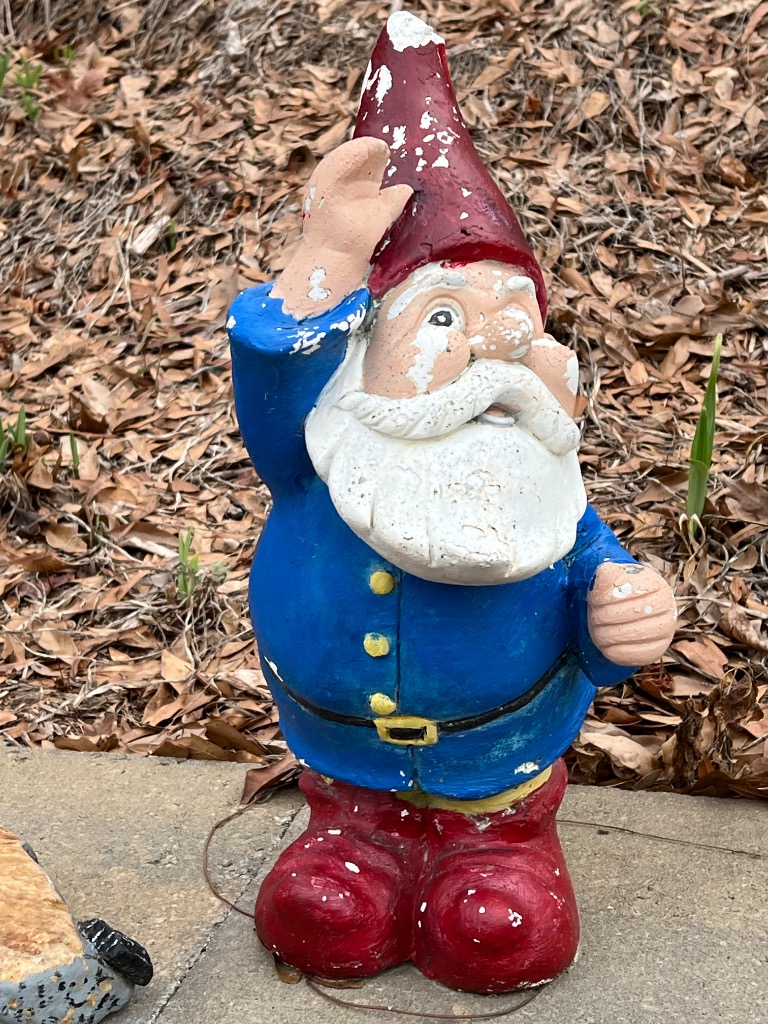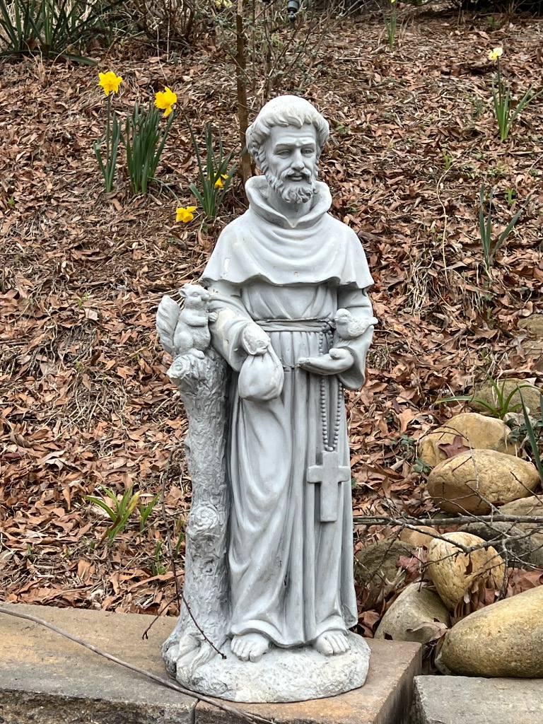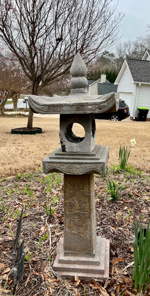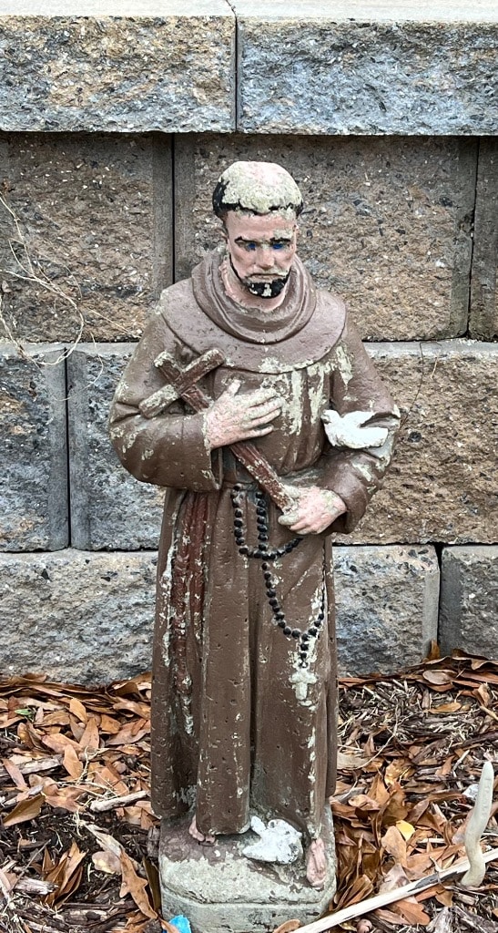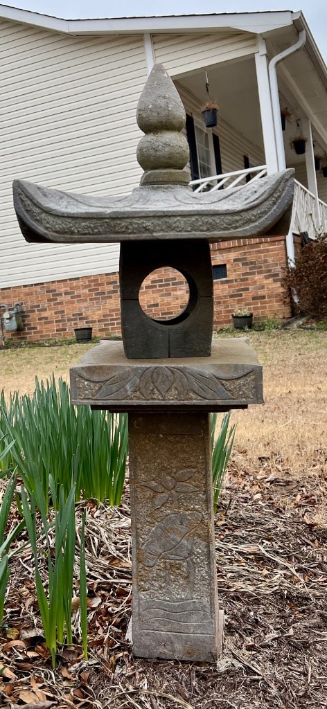Varioius yard ornaments including statues and stepping stones