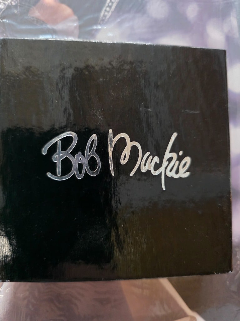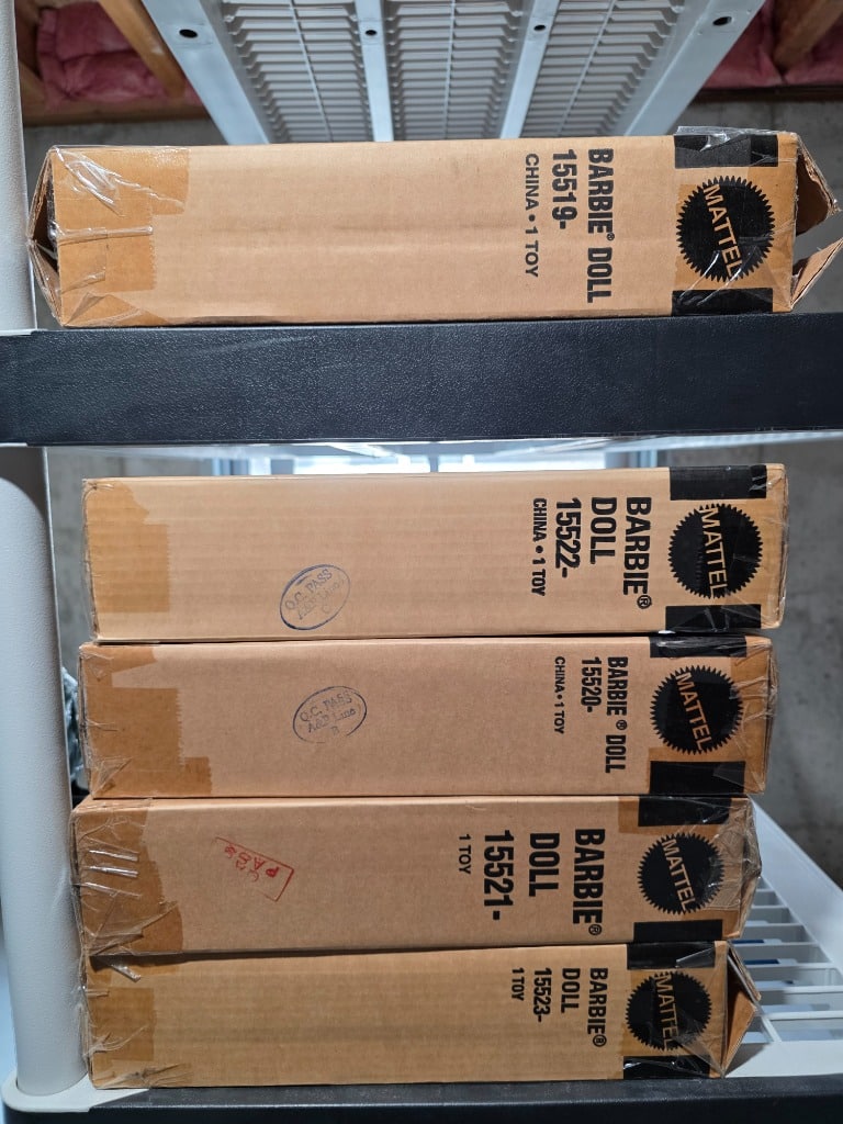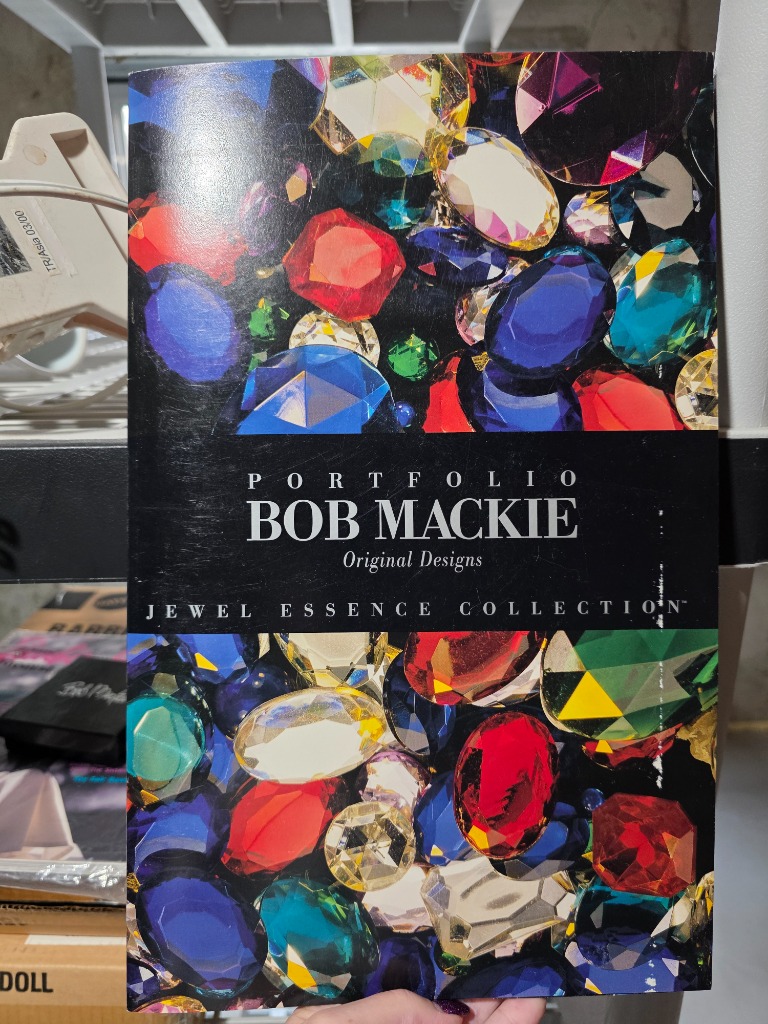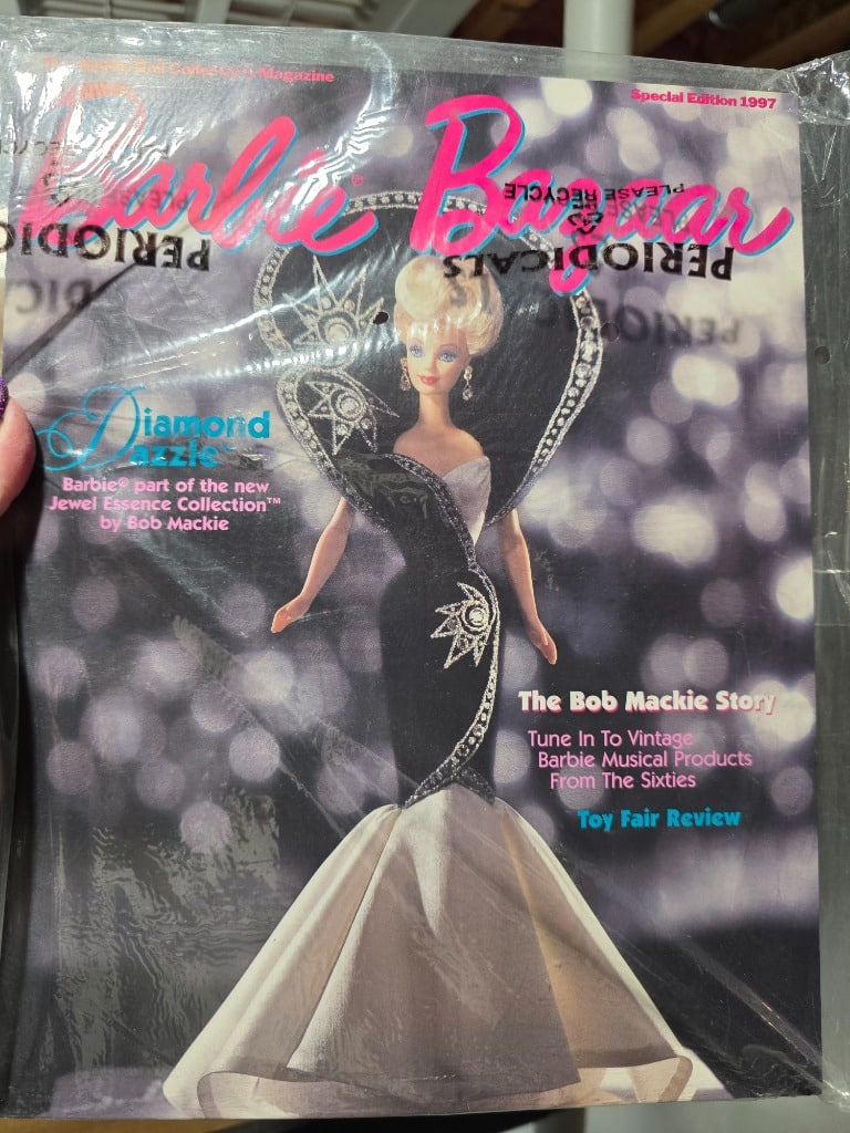 Bob Mackie collector Barbies still in shipping boxes as well as Bob Mackie Barbie catalog and accessory brooch