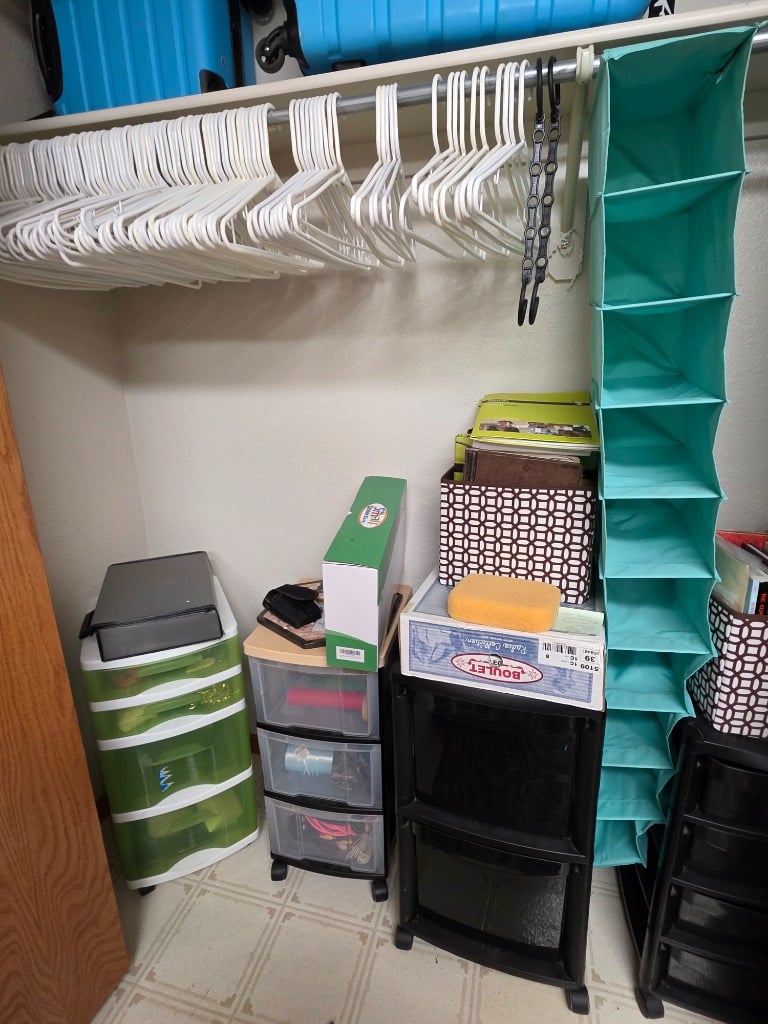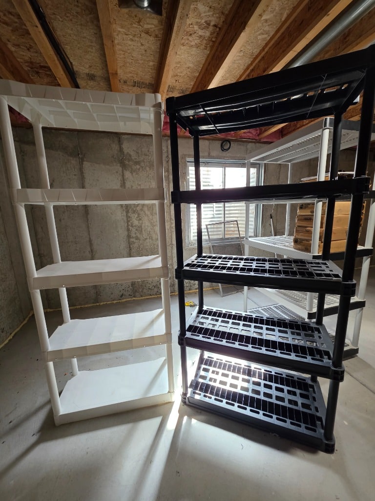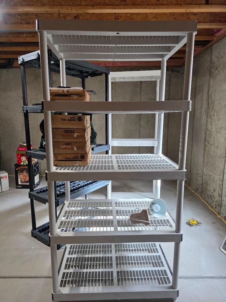Storage shelves, storage and organization bins