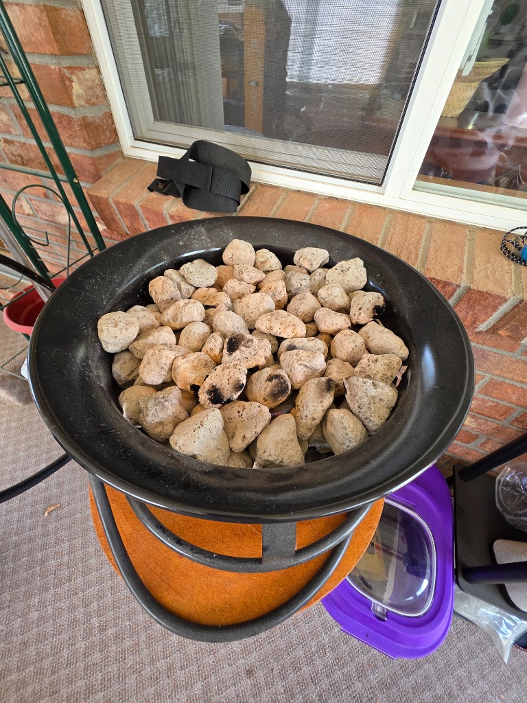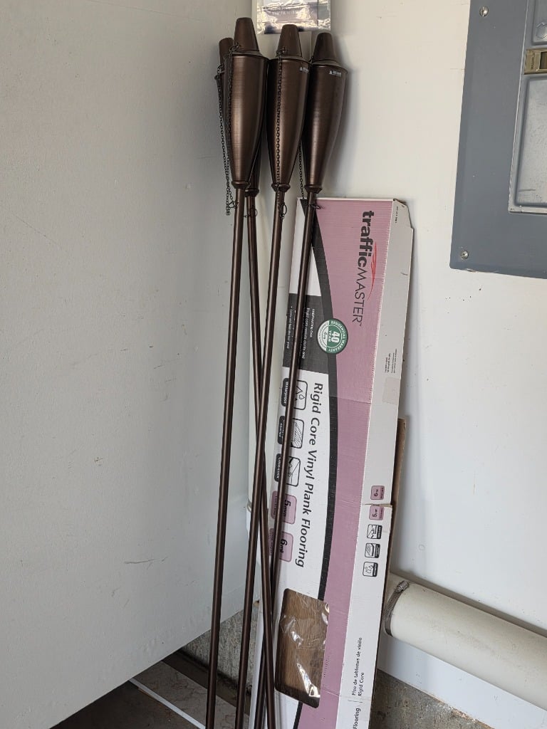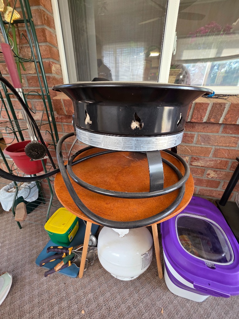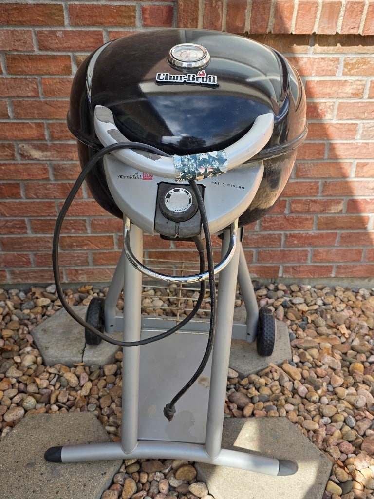 Propane BBQ with lava stones, electric grill, yard decor, tiki torches