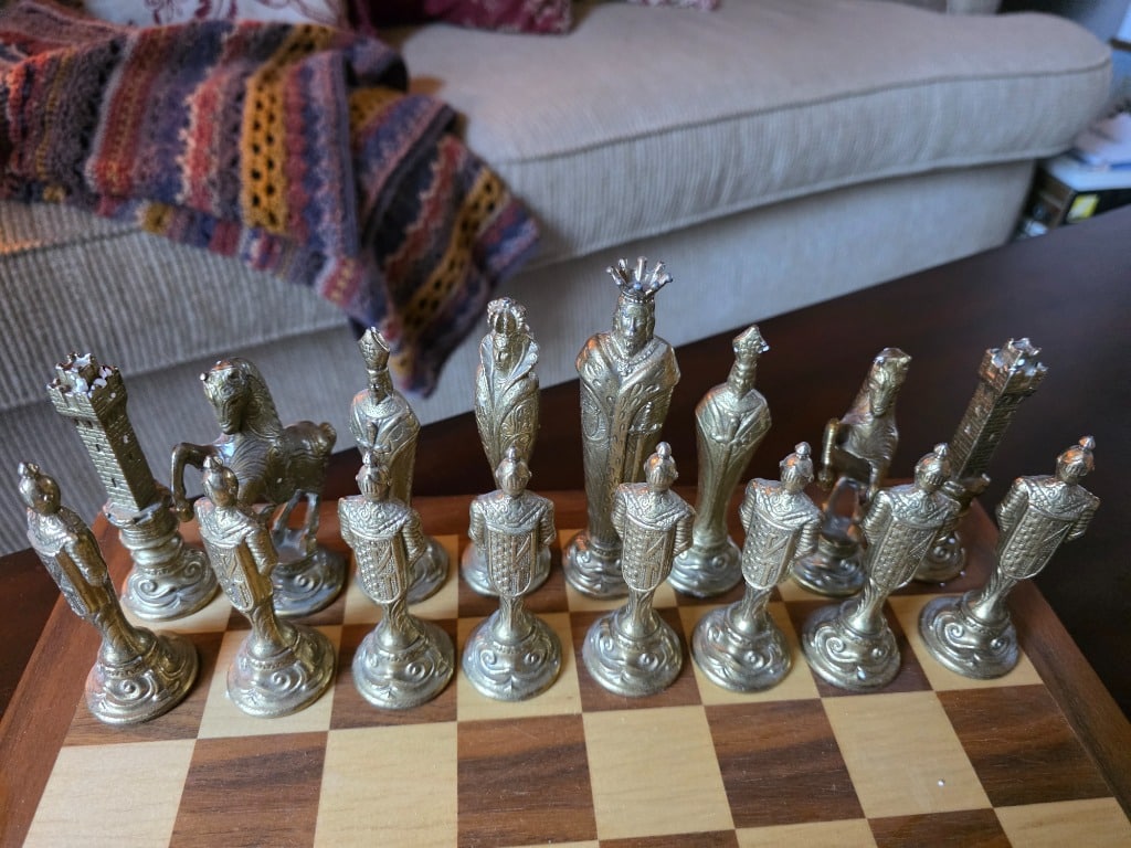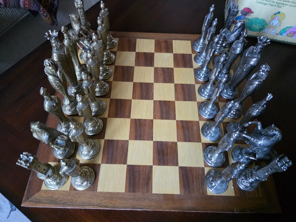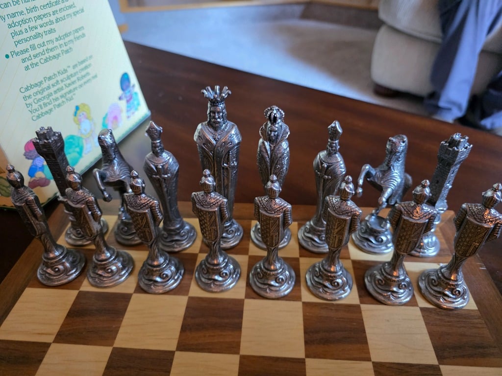 Hobbies: Beautiful chess set with cast metal pieces, Vintage Cabbage Patch dolls, painting supplies and frames, drones, Schwinn Jaguar bicycle
