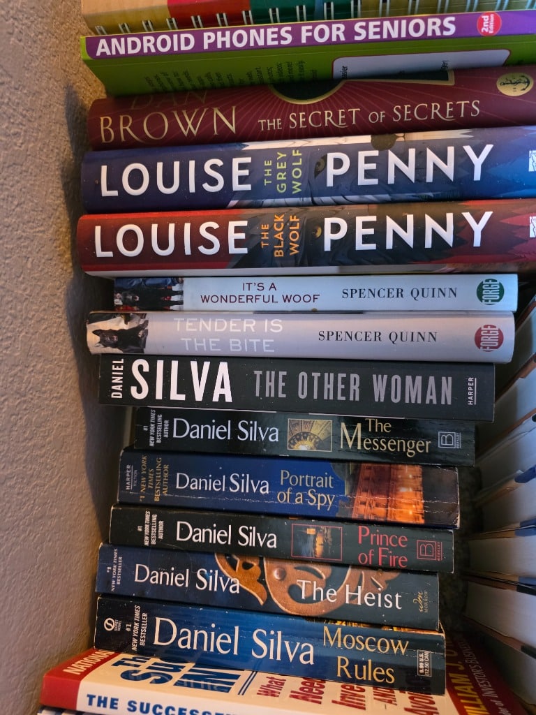 Extensive collection of books including mystery/detective series by Tony Hillerman, Martin Walker, Daniel Silva, Louise Penny. Also books about travel/destinations and much more!