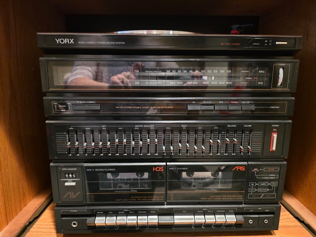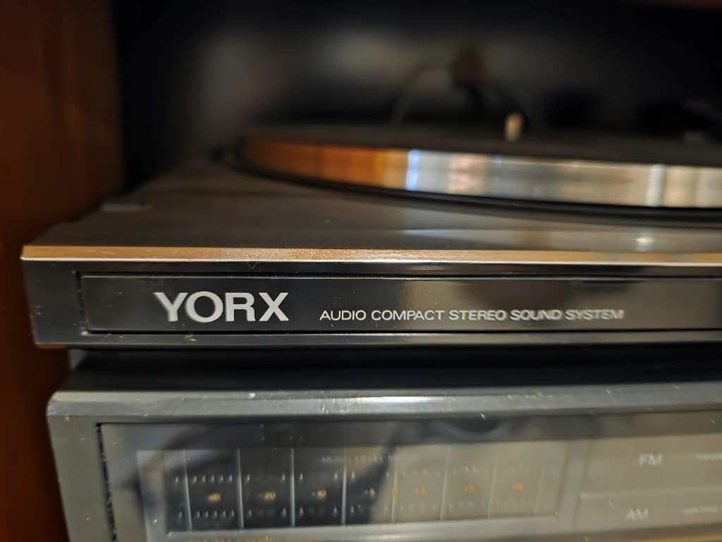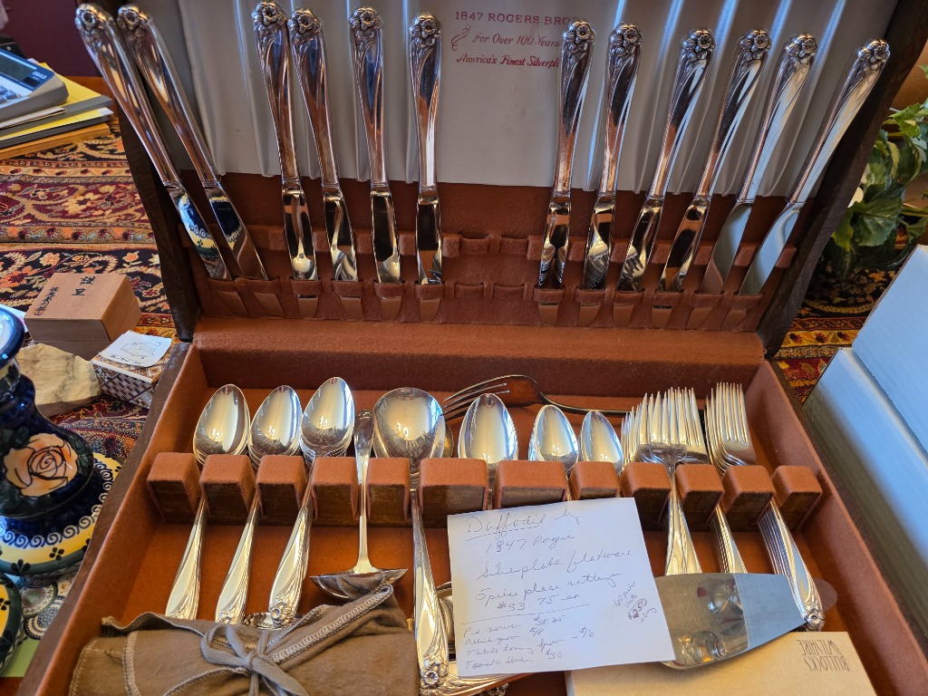 Entertaining: Full set of Frankoma dishes including serving and accessory pieces, Silver plated flatware in case, La Europa set by Himark, YORX stereo system