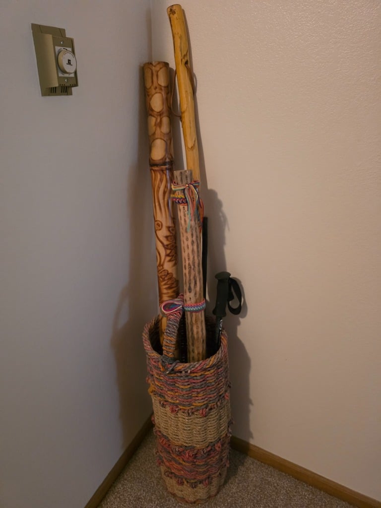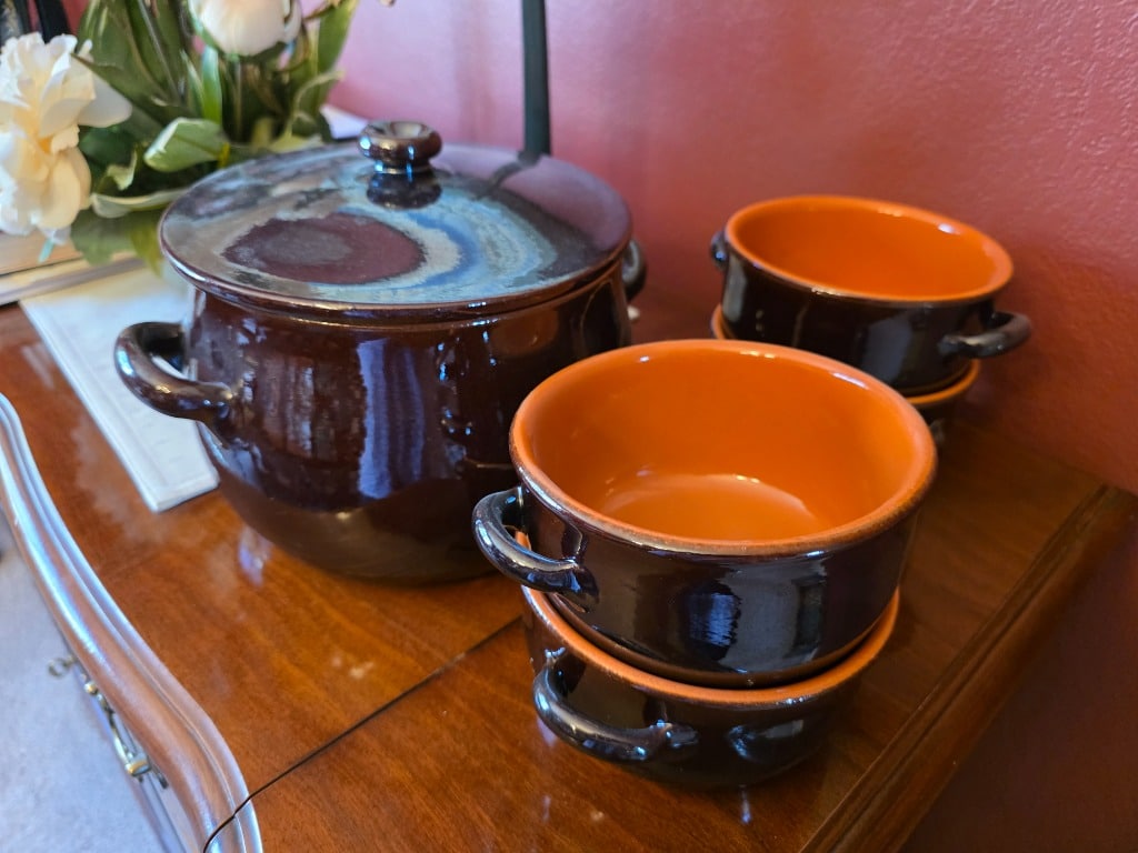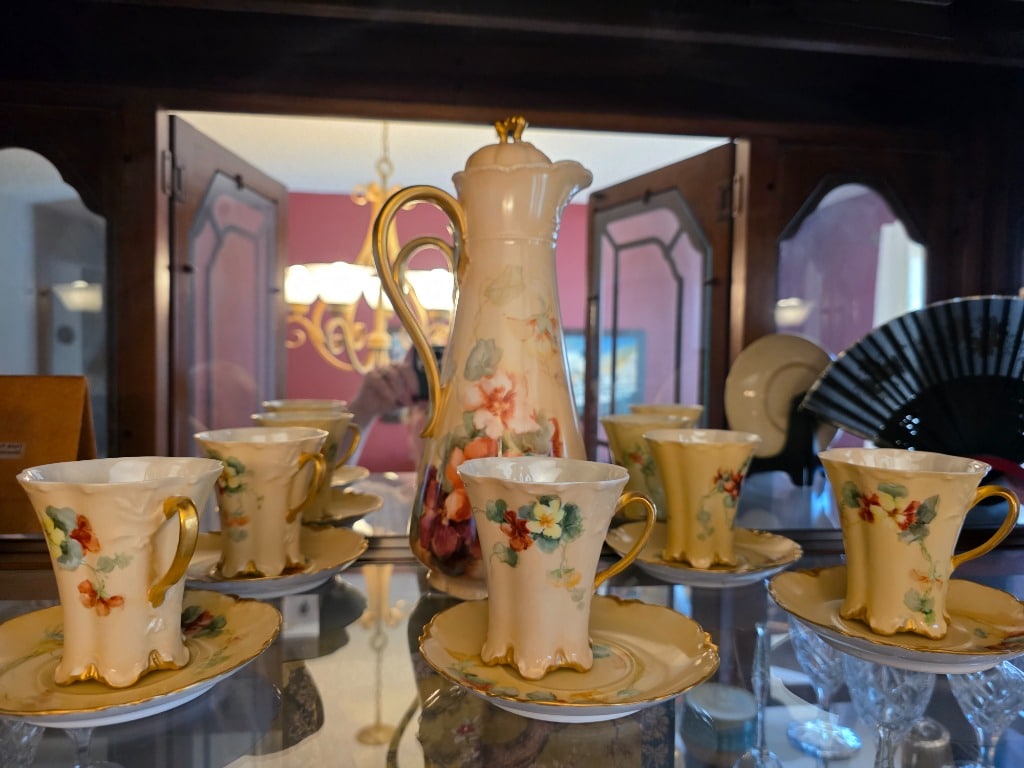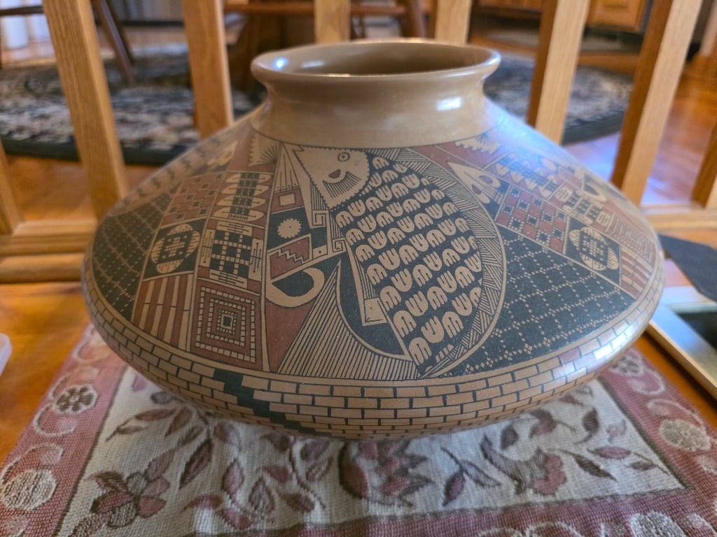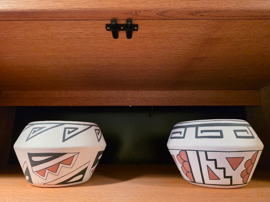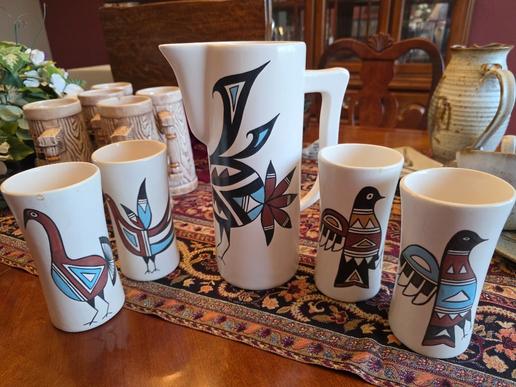 Decor: Native American wall art and pottery, Polish pottery, Haviland Hot Chocolate set, rain stick, digeridoo,