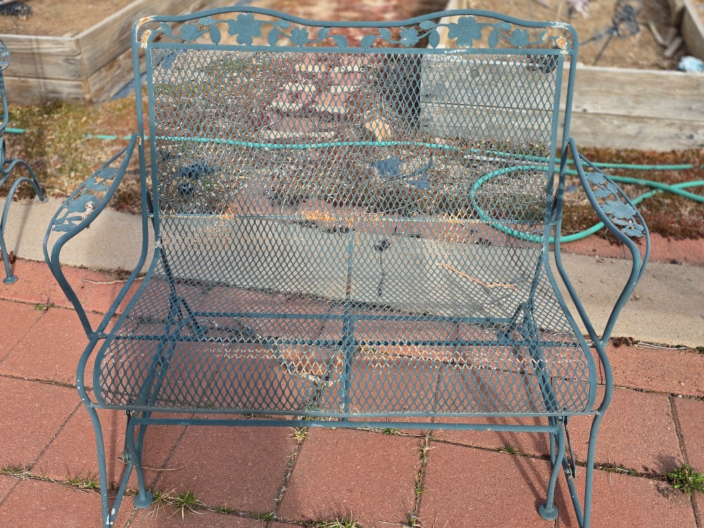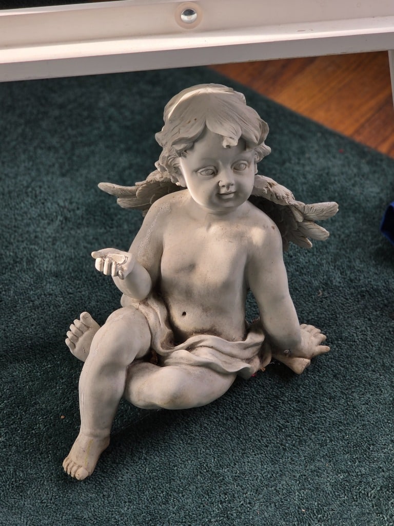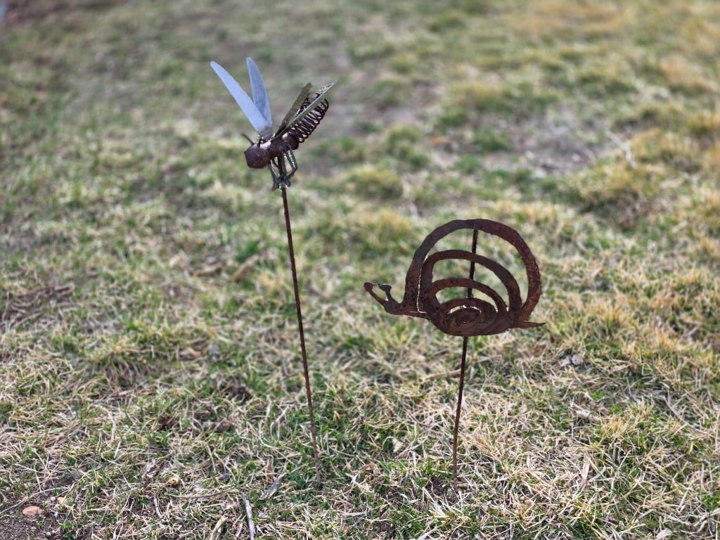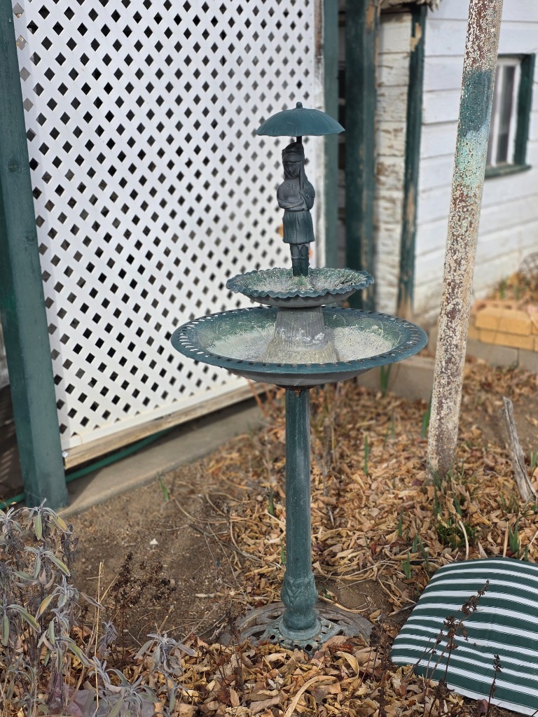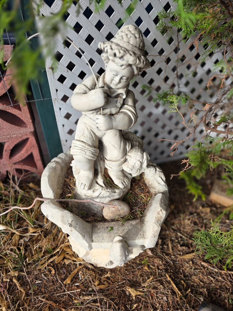 Great yard decor: Statues, metal stake pieces, cast-iron furniture, mower, bicycles, hanging swing chair, electric grill, bird baths