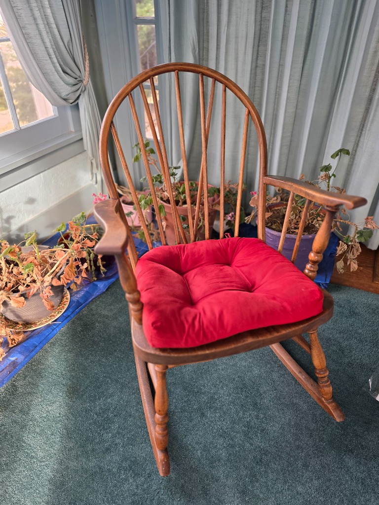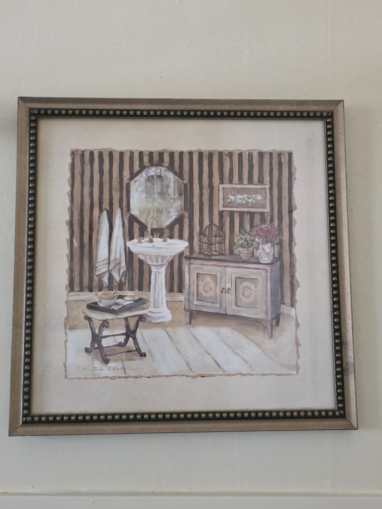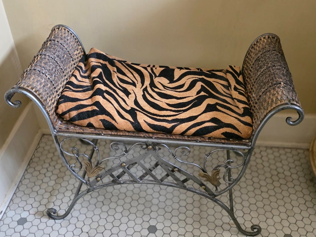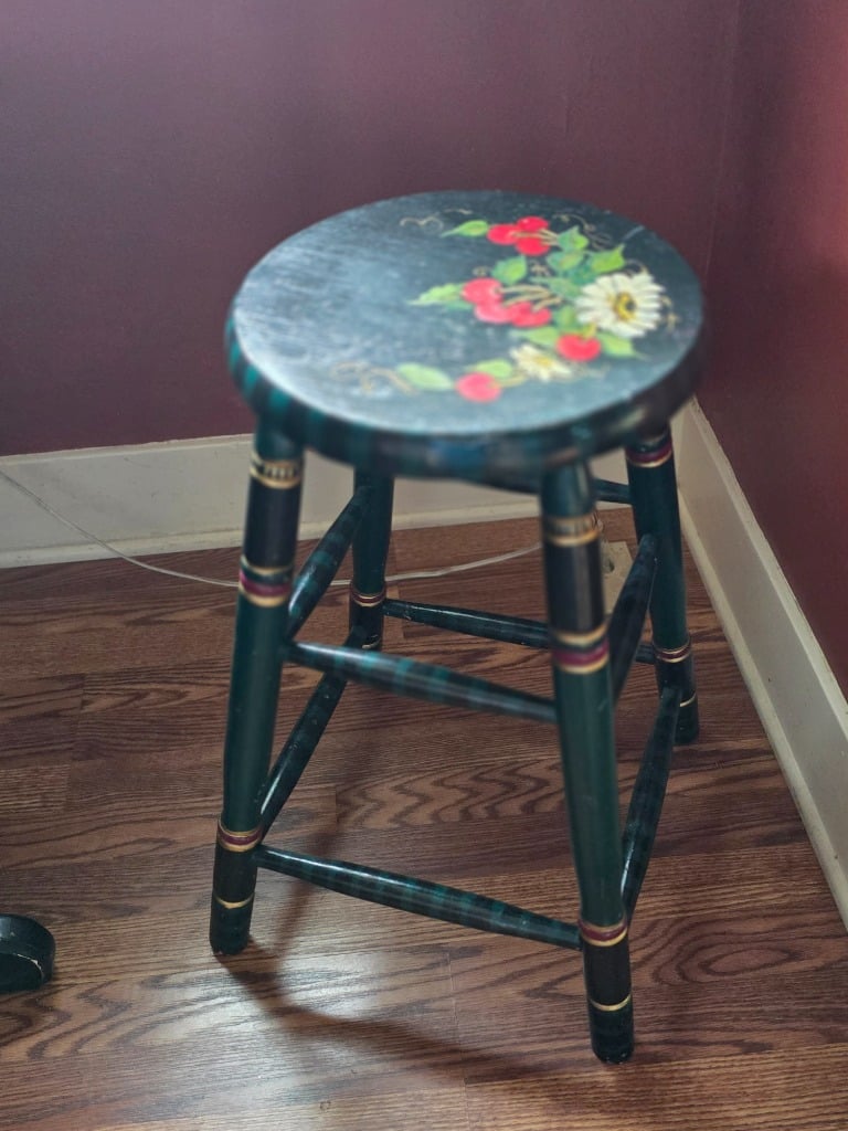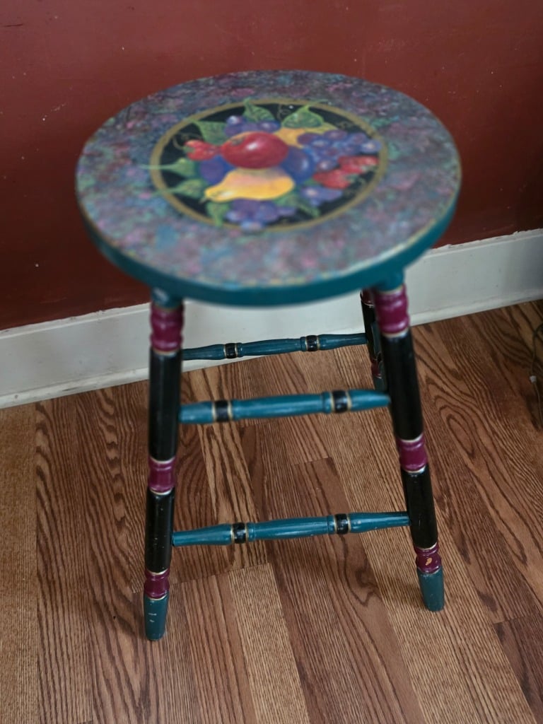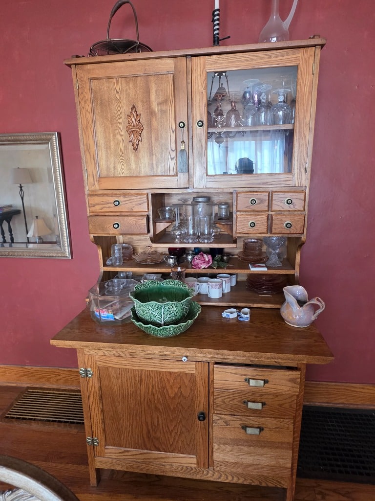 The artistry continued into the remainder of the house with vivid red sofa and loveseat along with contrasting black and white accessory pieces and hand-painted stools. There are a few lovely antique pieces as well: Hoosier cabinet, dressers, wash stand, side chairs, vintage porcelain kitchen stove, baby pram
