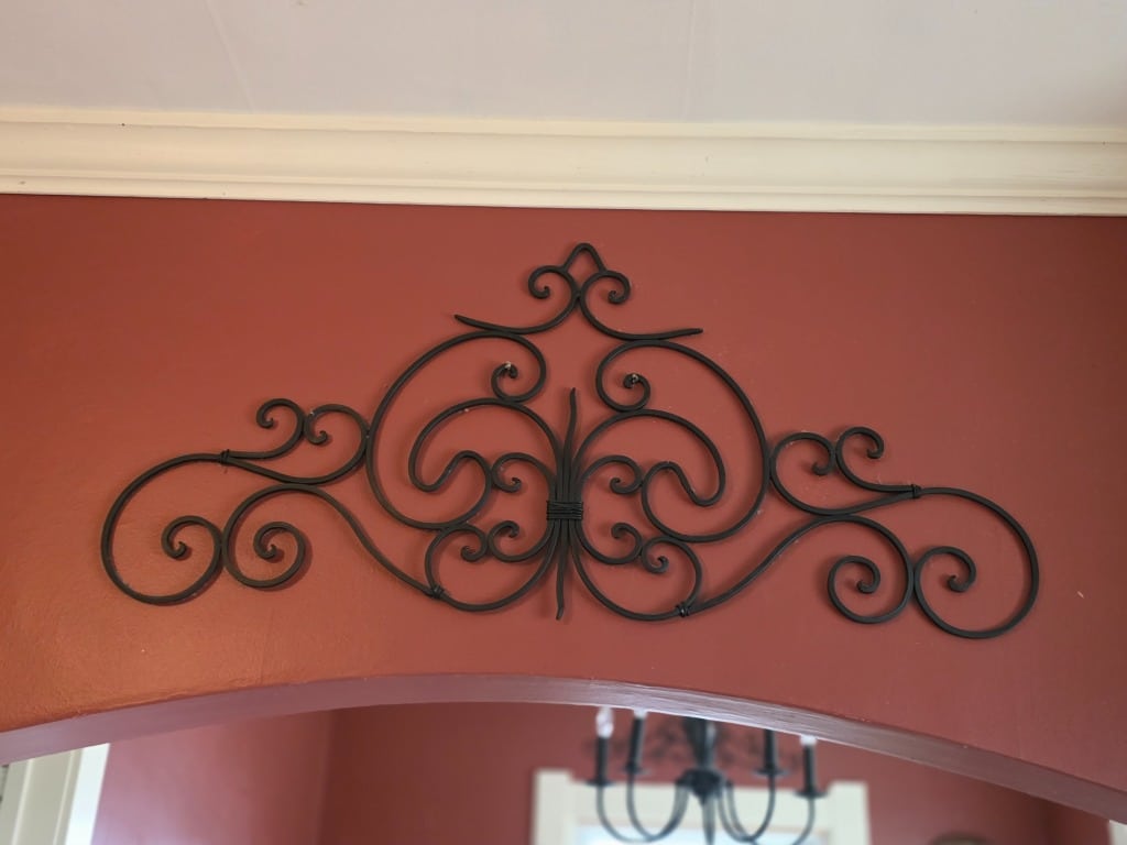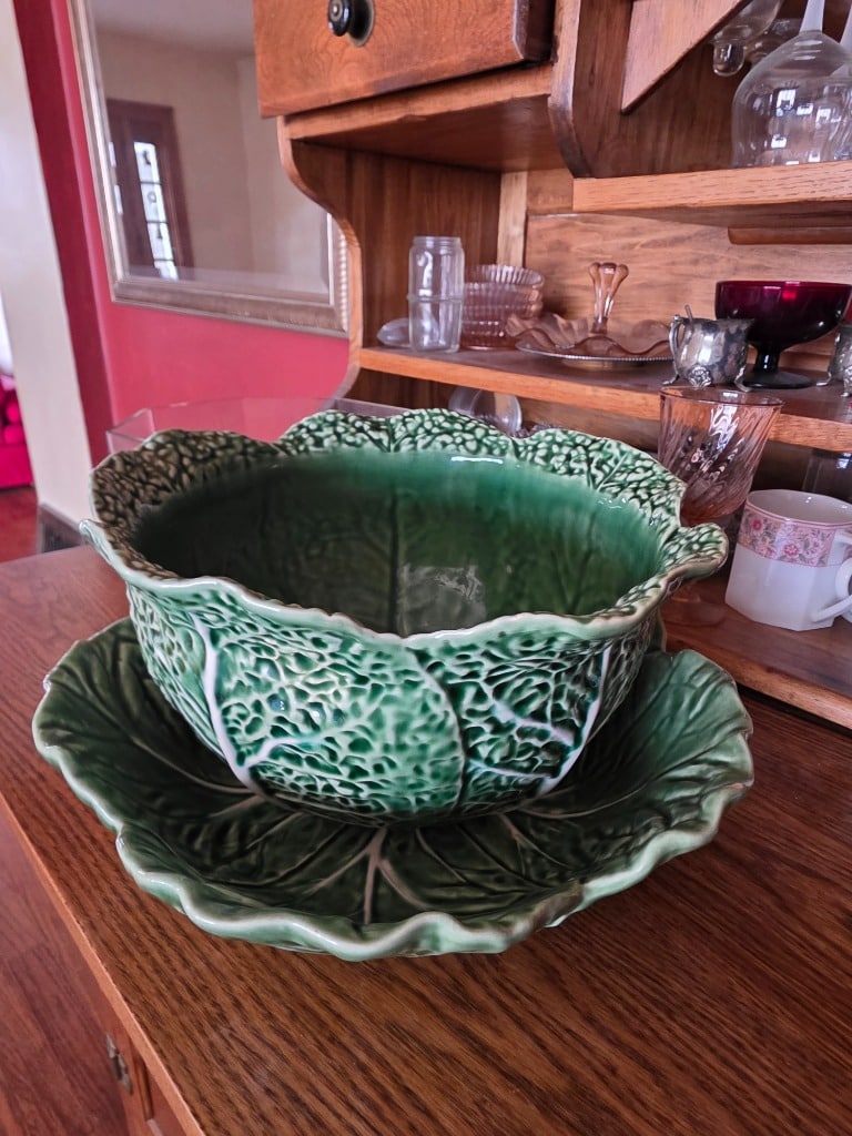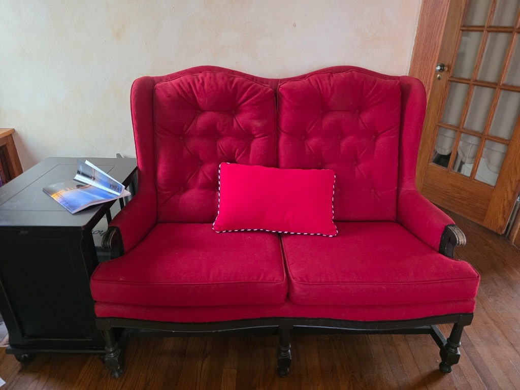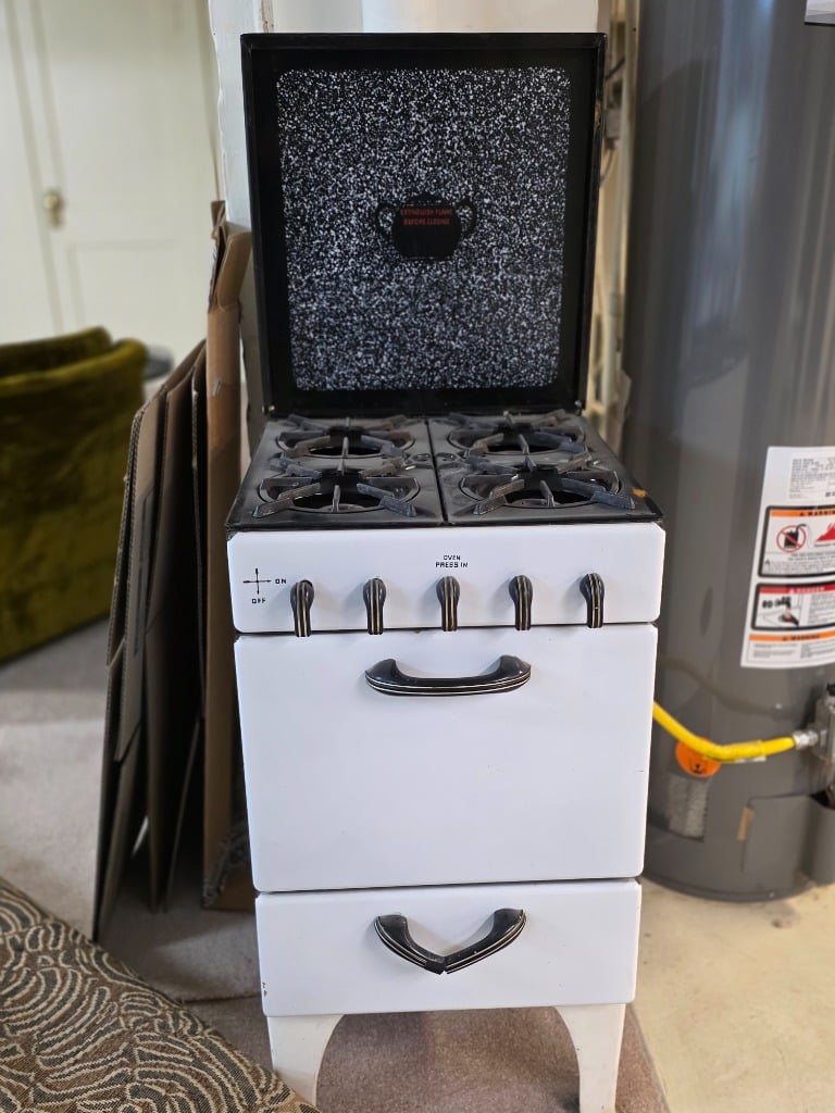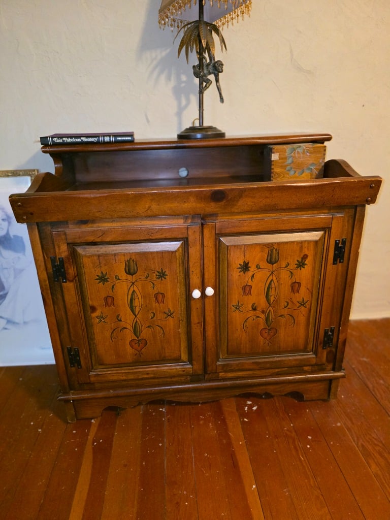 The artistry continued into the remainder of the house with vivid red sofa and loveseat along with contrasting black and white accessory pieces and hand-painted stools. There are a few lovely antique pieces as well: Hoosier cabinet, dressers, wash stand, side chairs, vintage porcelain kitchen stove, baby pram
