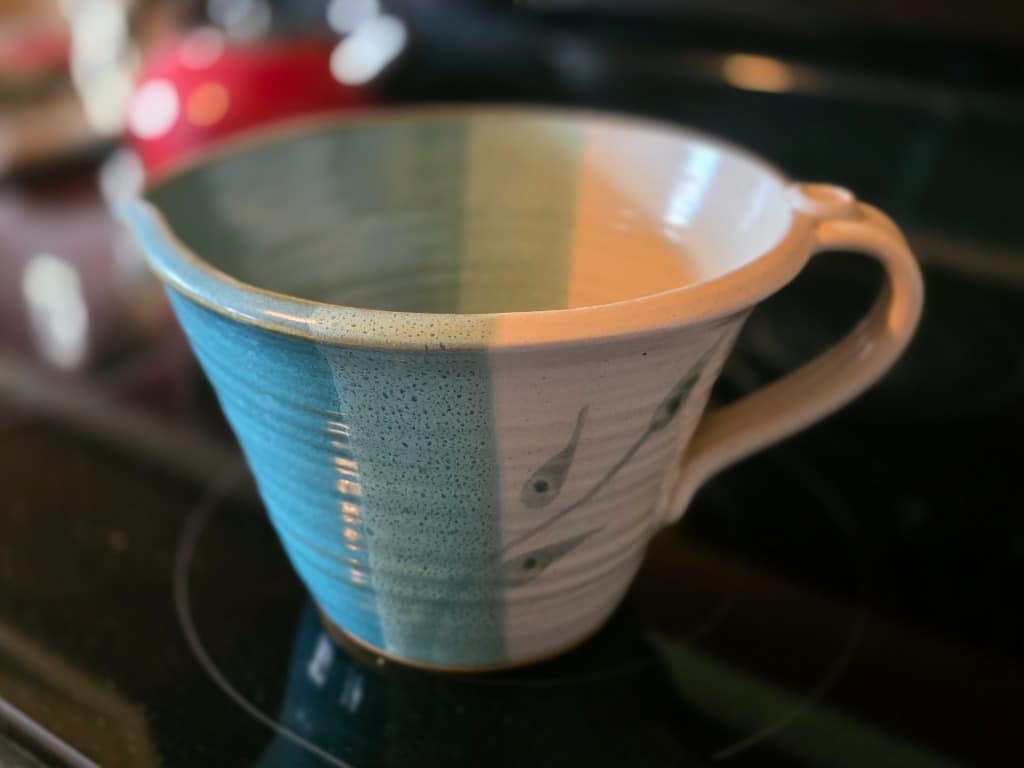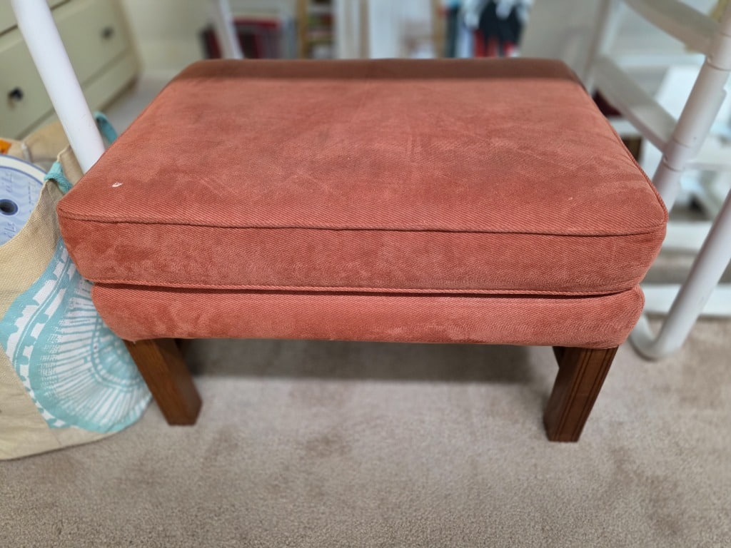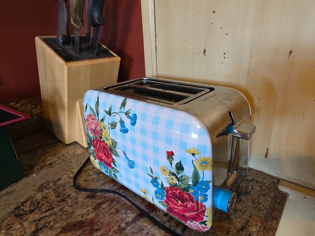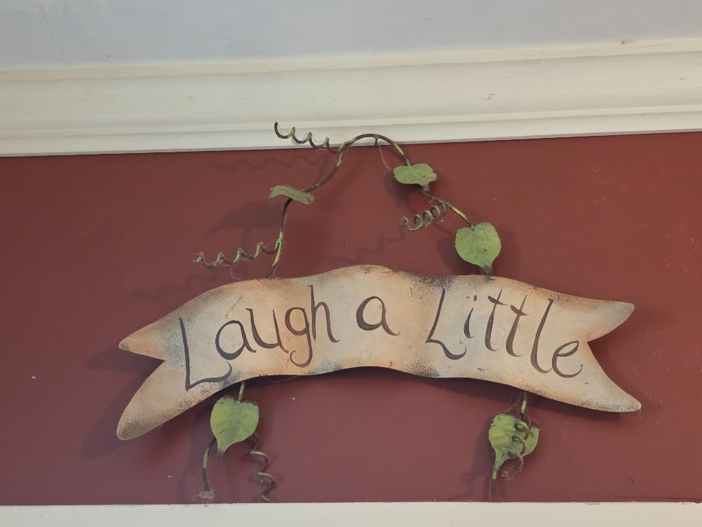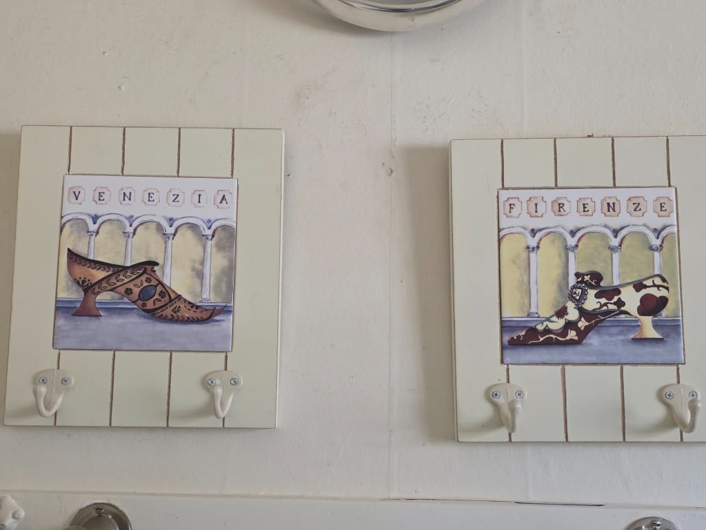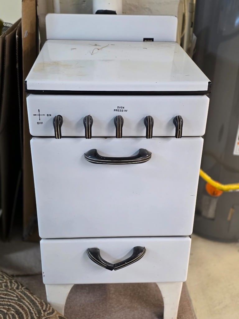 The artistry continued into the remainder of the house with vivid red sofa and loveseat along with contrasting black and white accessory pieces and hand-painted stools. There are a few lovely antique pieces as well: Hoosier cabinet, dressers, wash stand, side chairs, vintage porcelain kitchen stove, baby pram