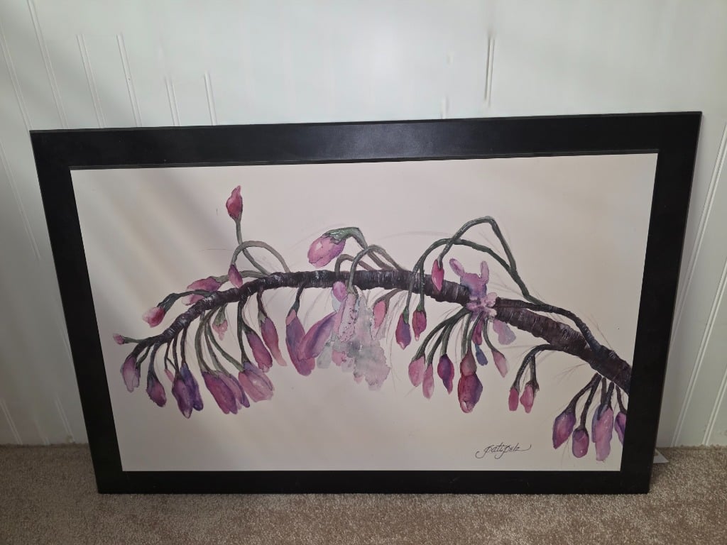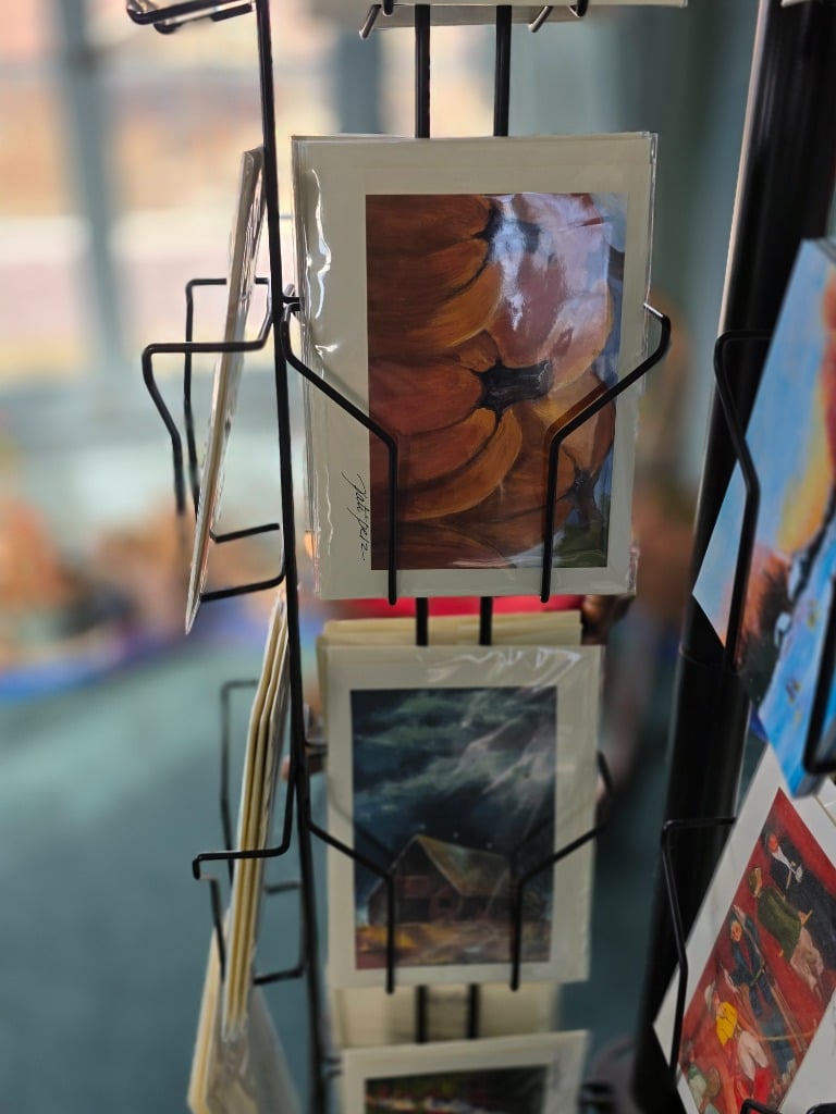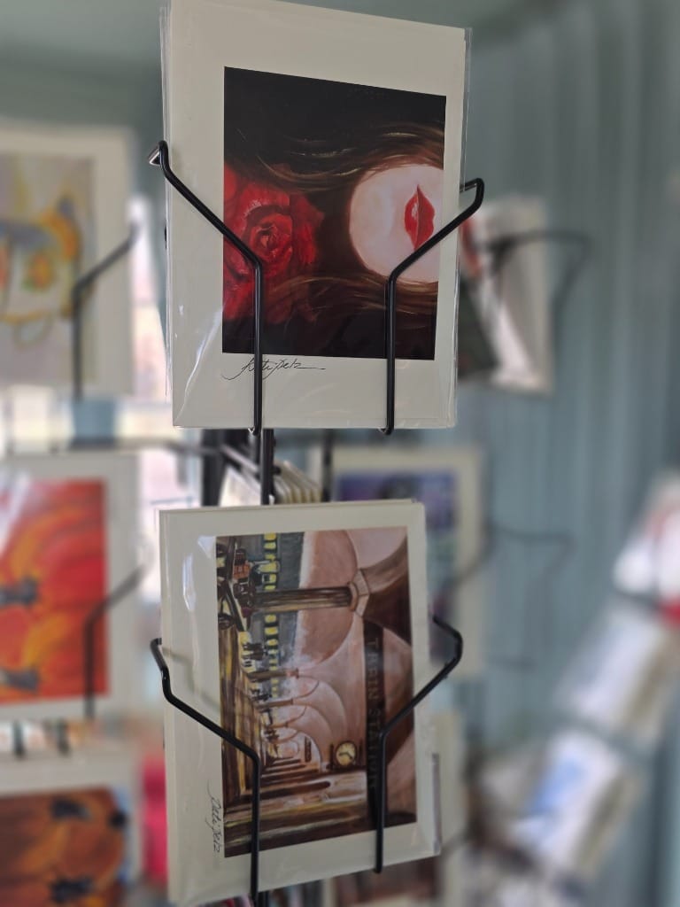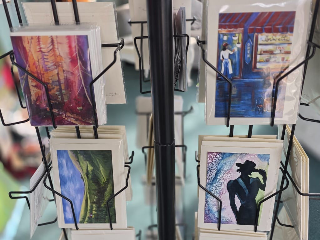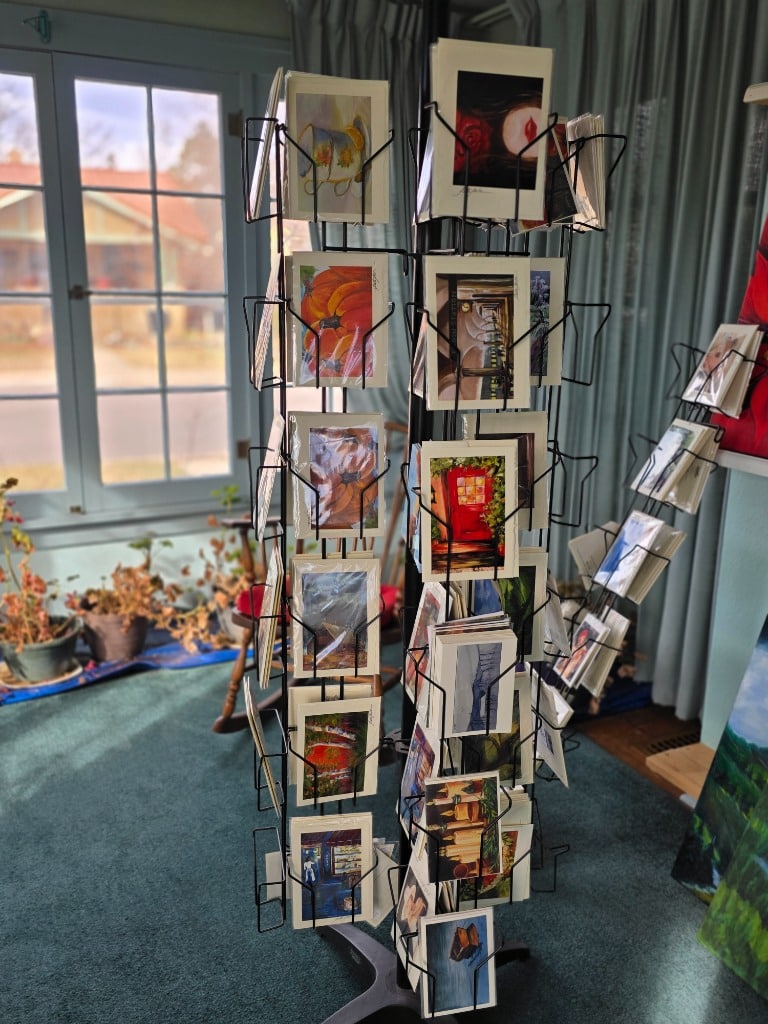 Several pieces of her finished wall art as well as postcards, greeting cards, and prints of her work