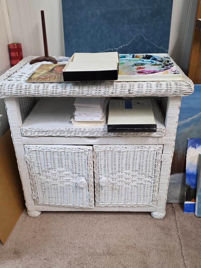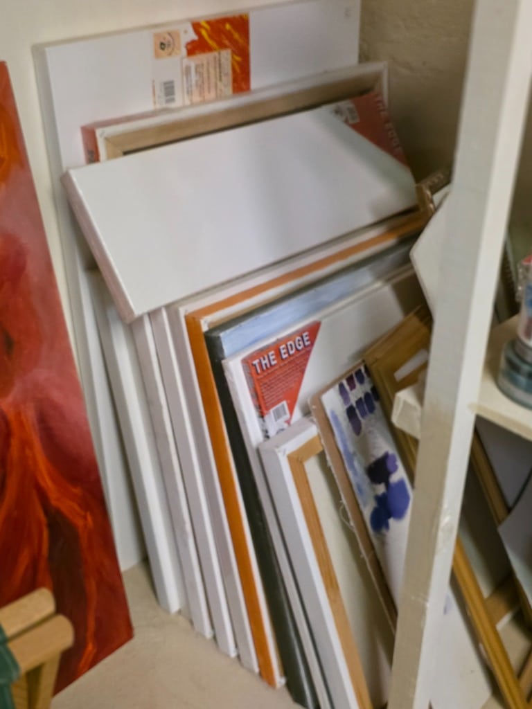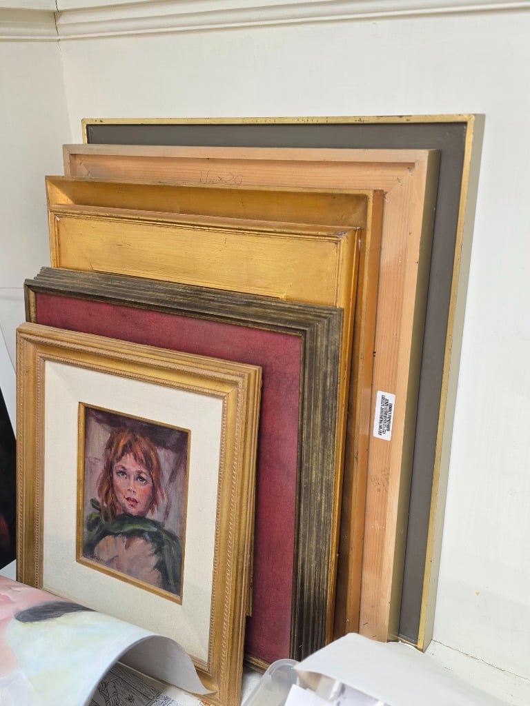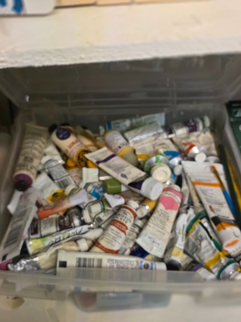 The sale is for a local artist who worked in a variety of media. We have all the things a great artist needs: Canvases, oil paints, water color paints, colored pencils, collage media, easels, paint brushes, stamps, ribbons, supply storage, art method and history books. You just bring your imagination and talent!