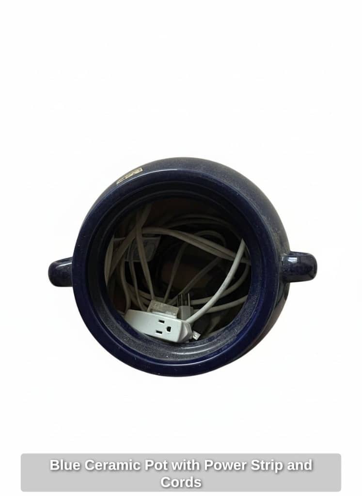 Blue Ceramic Pot with Power Strip and Cords