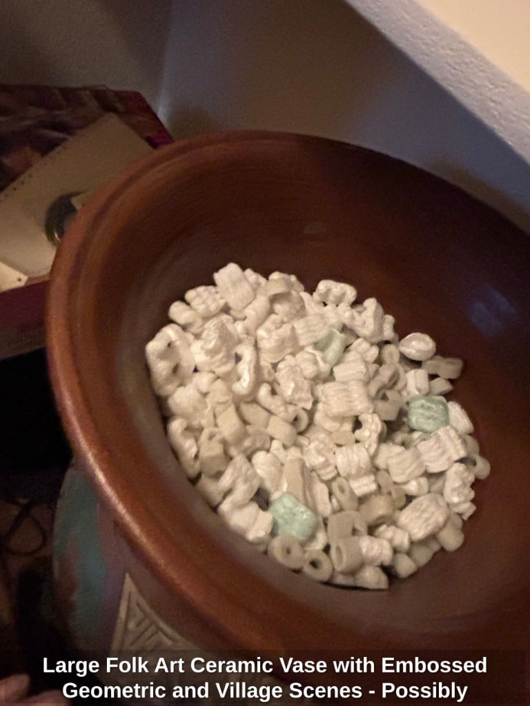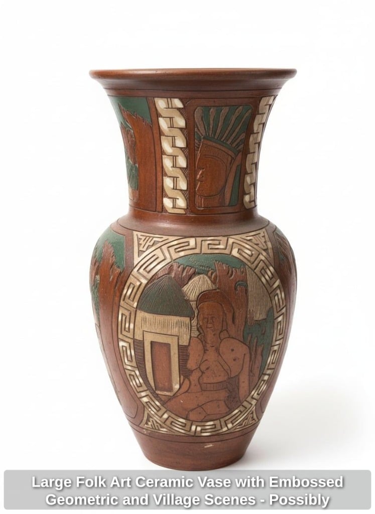Large Folk Art Ceramic Vase with Embossed Geometric and Village Scenes – Possibly Mexican or Southwestern