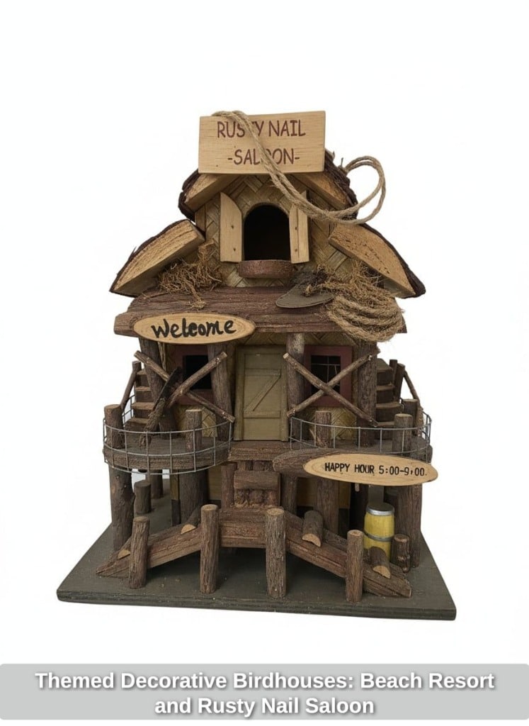 Themed Decorative Birdhouses: Beach Resort and Rusty Nail Saloon