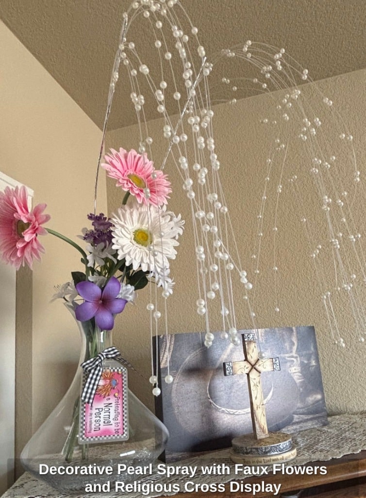 Decorative Pearl Spray with Faux Flowers and Religious Cross Display