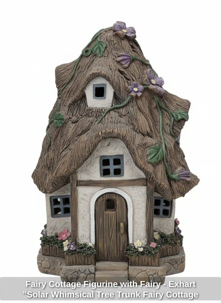 Fairy Cottage Figurine with Fairy – Exhart “Solar Whimsical Tree Trunk Fairy Cottage Garden Statue”