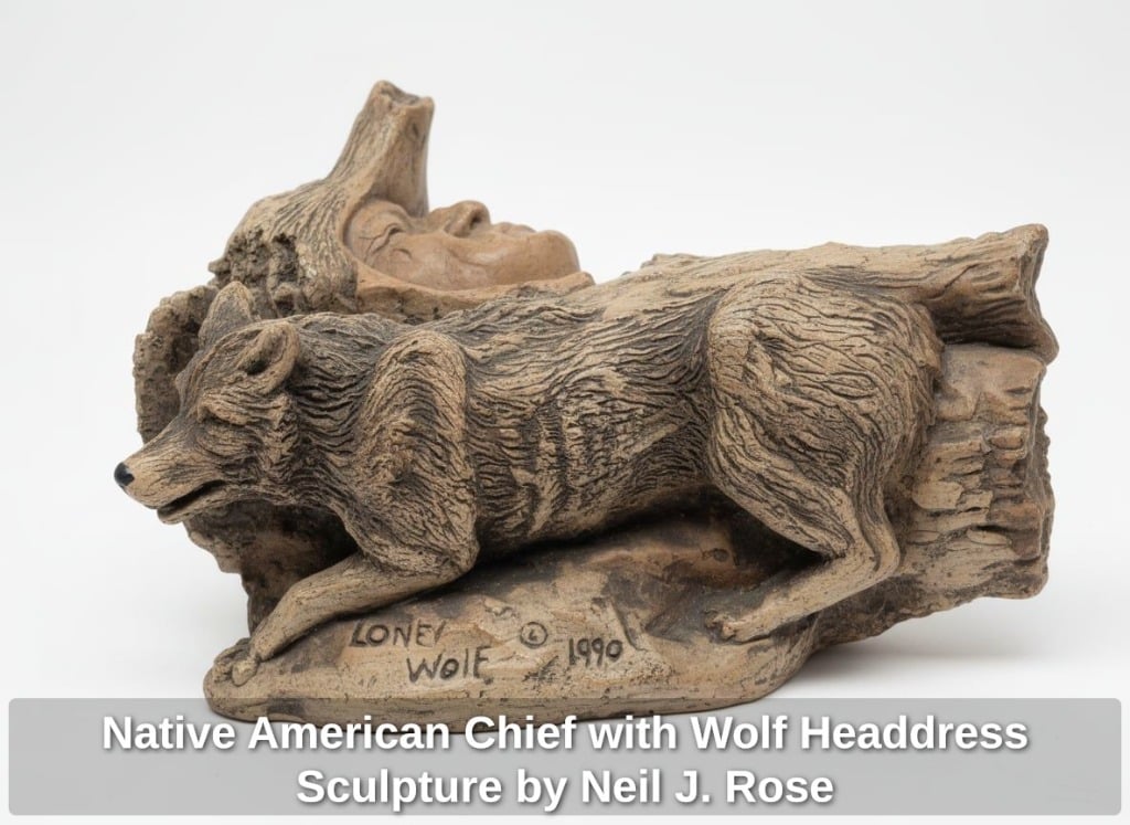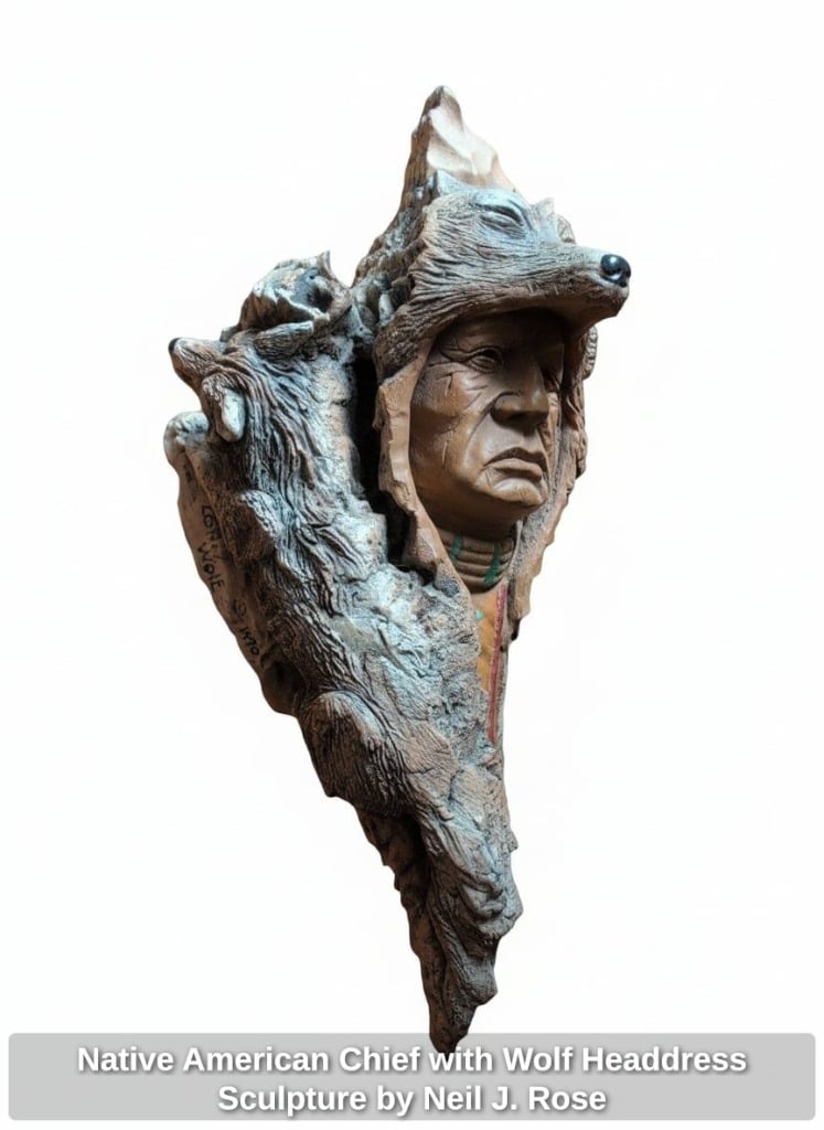 Native American Chief with Wolf Headdress Sculpture by Neil J. Rose