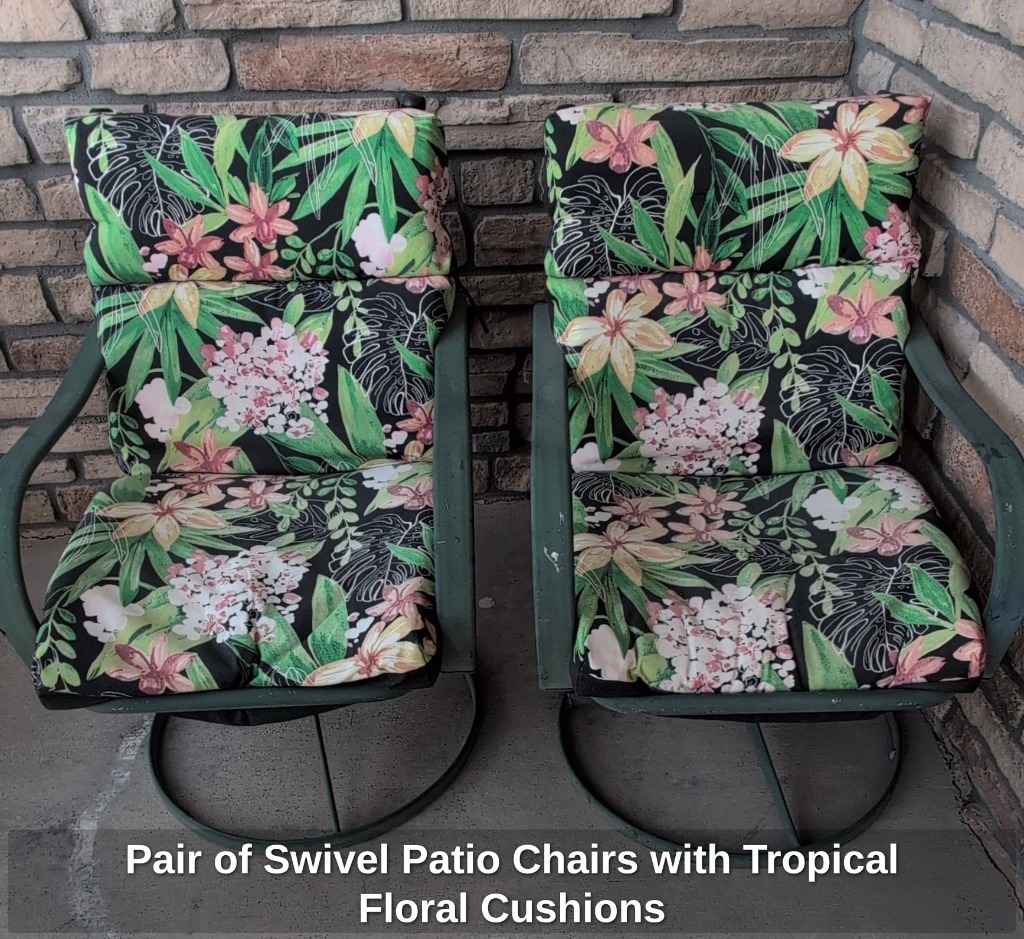 Pair of Swivel Patio Chairs with Tropical Floral Cushions