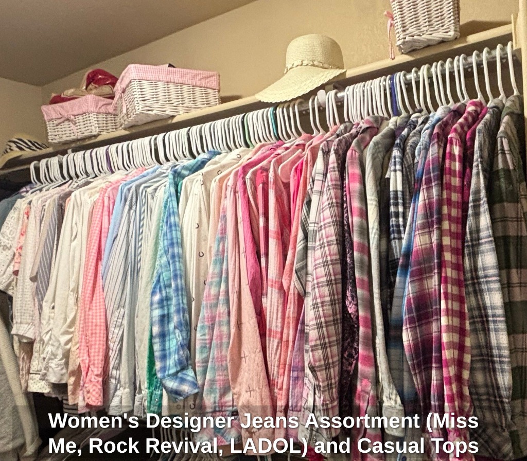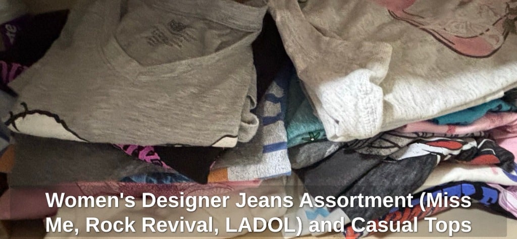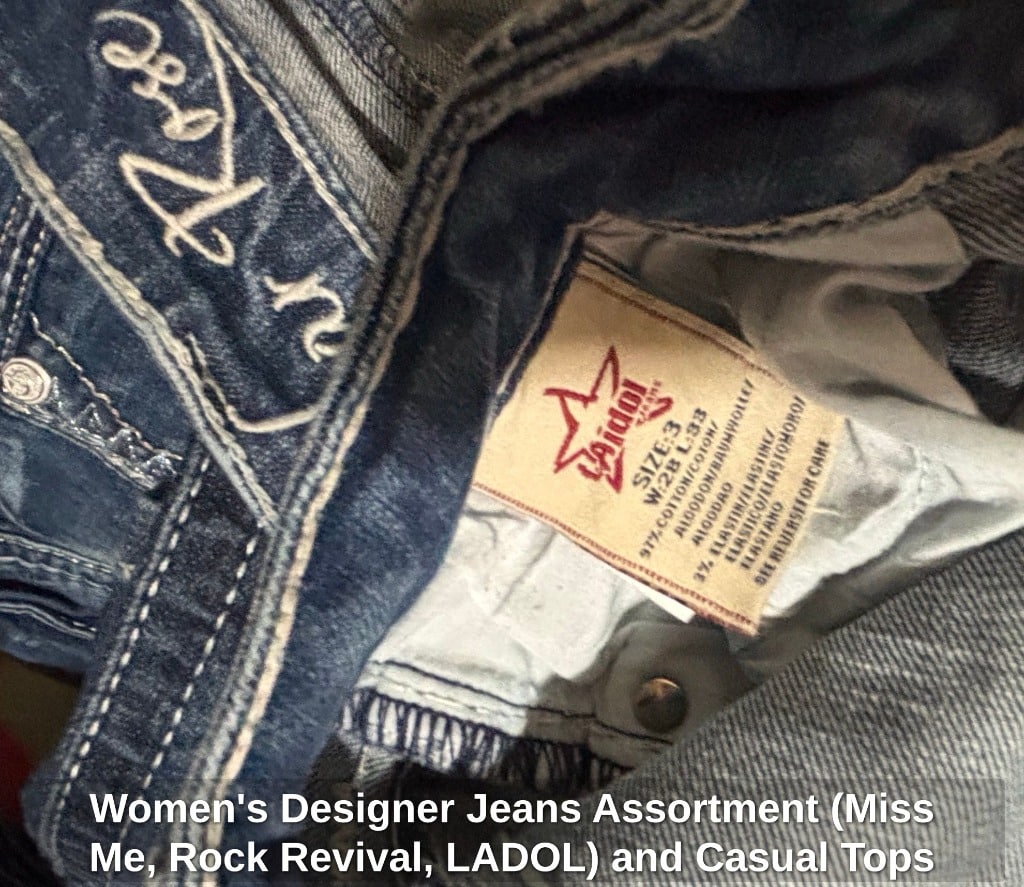 Women’s Designer Jeans Assortment (Miss Me, Rock Revival, LADOL) and Casual Tops