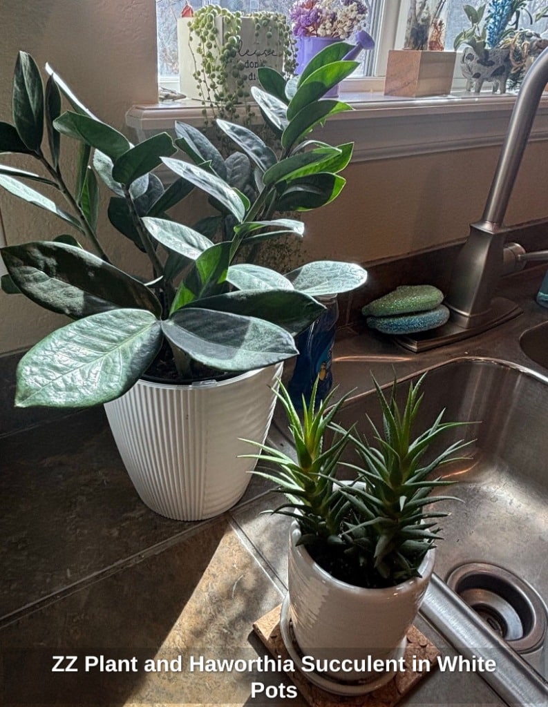 ZZ Plant and Haworthia Succulent in White Pots