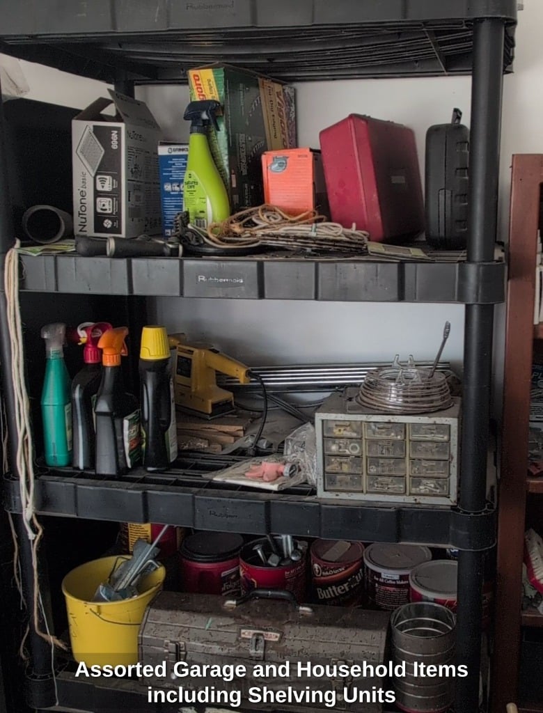 Assorted Garage and Household Items including Shelving Units