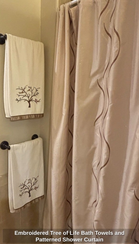 Embroidered Tree of Life Bath Towels and Patterned Shower Curtain