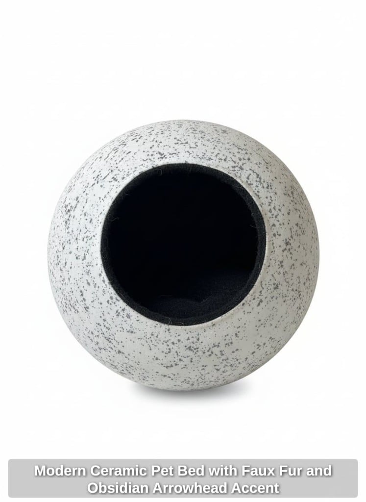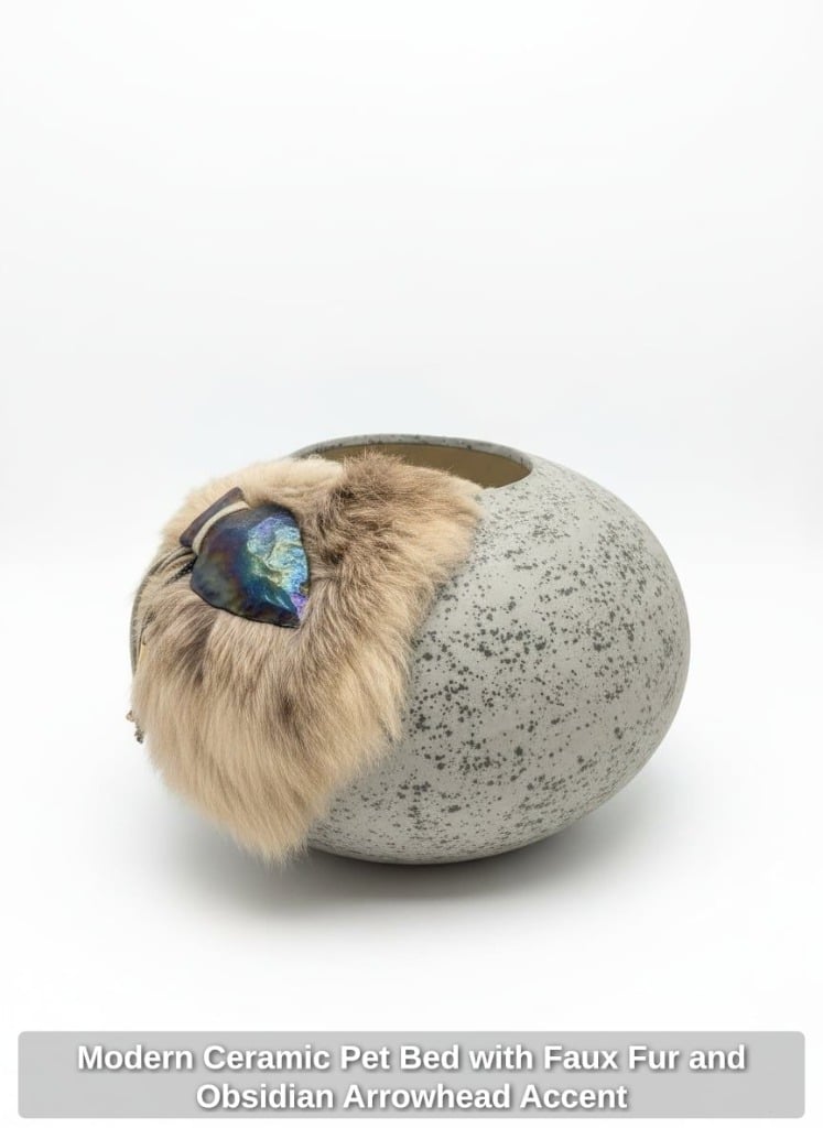 Modern Ceramic Pet Bed with Faux Fur and Obsidian Arrowhead Accent