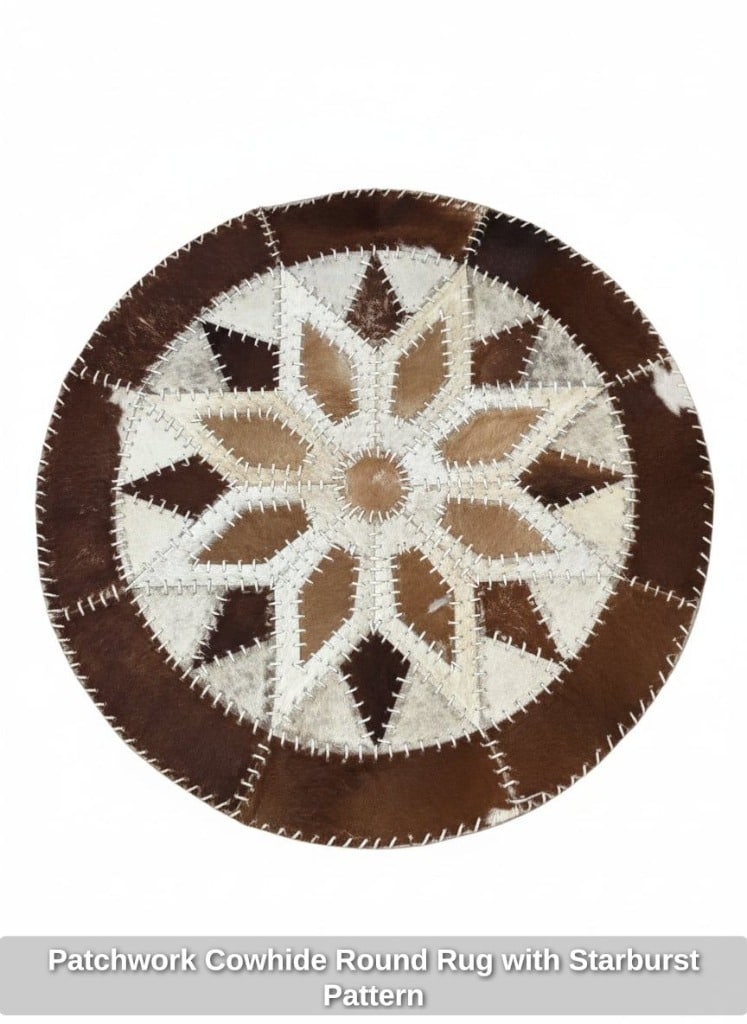 Patchwork Cowhide Round Rug with Starburst Pattern