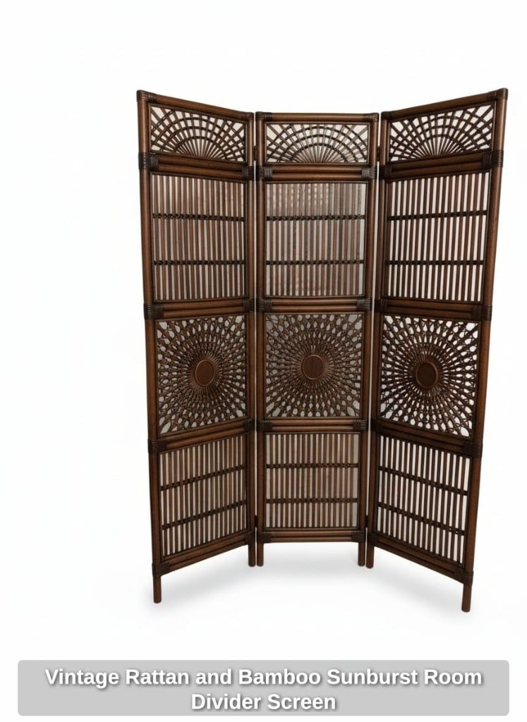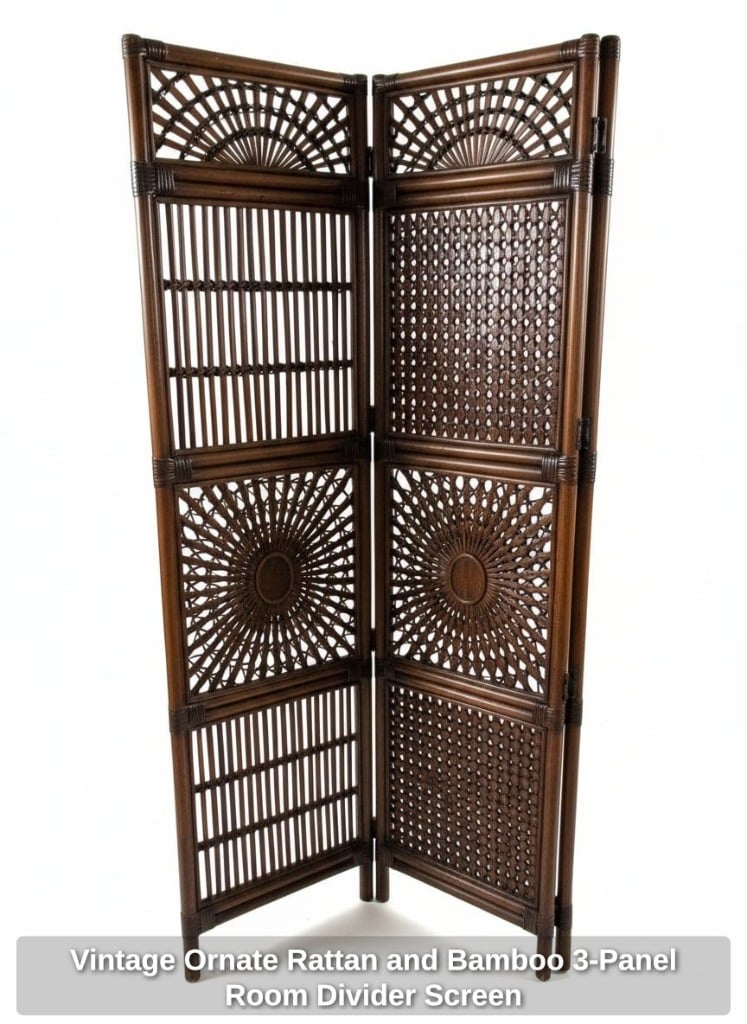Vintage Ornate Rattan and Bamboo 3-Panel Room Divider Screen