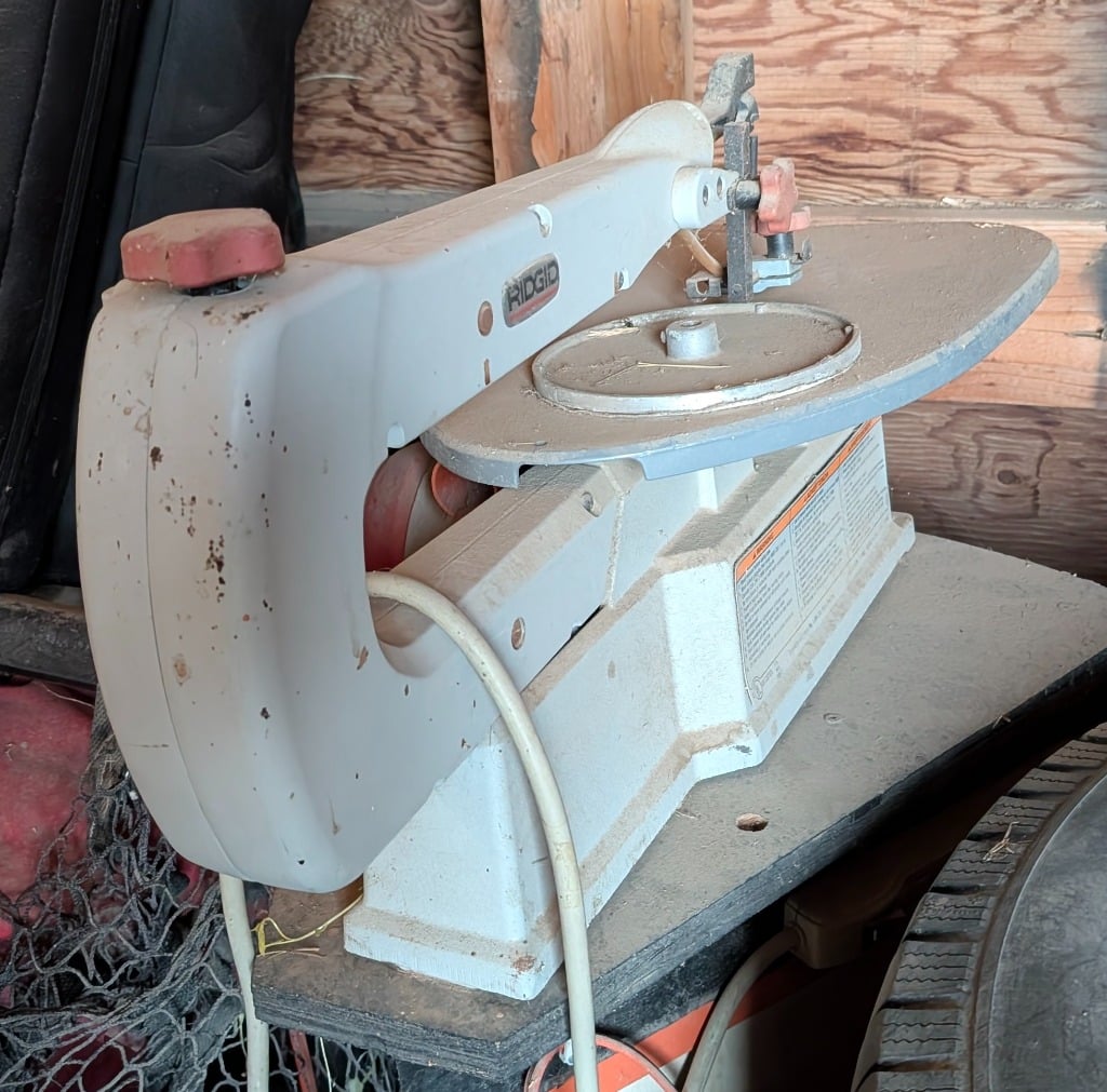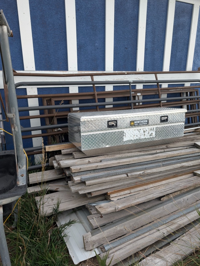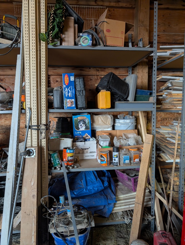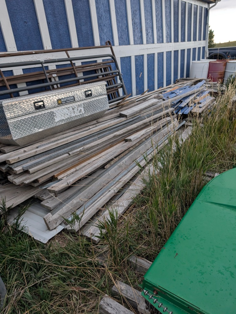 Commercial grade Metal shelving, Metal Dog house, Wire, Box Screen, White Lighting Fencing, Brush Hog, Hydraulic lift trailer, 2×6 square posts, Drag, Composter, Wood, Saws, Tool Bench, Drill Press, Ramps, Scroll Saw, Tools, Building supplies, Pressure washer and lots of other tools and toys!