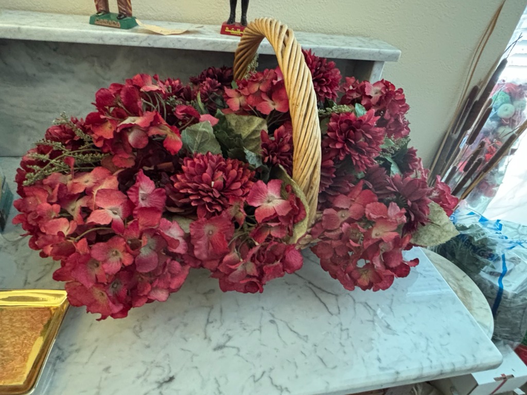 Artificial Floral Arrangement with Hydrangeas and Dahlias in Wicker Basket